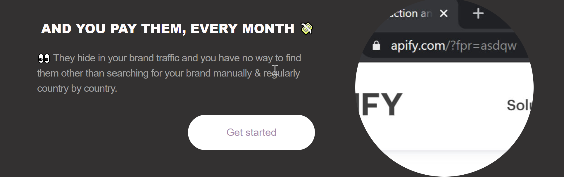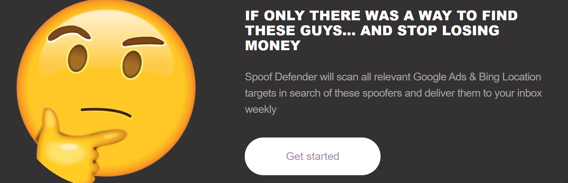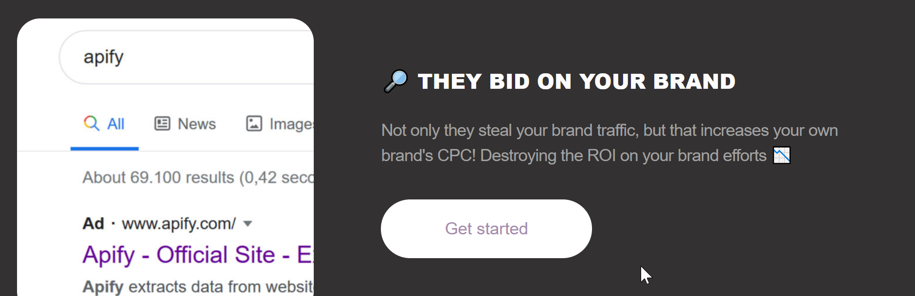 We help you find those pesky affiliates who buy search ads for your brand terms behind your back. You're welcome! you can then invest that money in growing your company ? instead of running after opportunistic people. All we need to start is the brand term you want to track and an email to send the reports to (your marketing team's most likely), and you're ready to start busting those brand Spoofers!