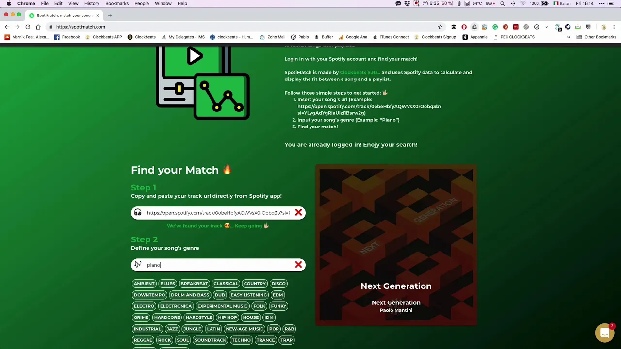 SpotiMatch is a FREE tool for Artists, Playlists Curators and Labels, that allows its users to match songs with independent playlists on Spotify. With SpotiMatch, Spotify Artists and Curators are now able to identify the level of fit between a playlist and a song, with no time. Just in one click, SpotiMatch will show you a ranking of the most matching playlists for your song!