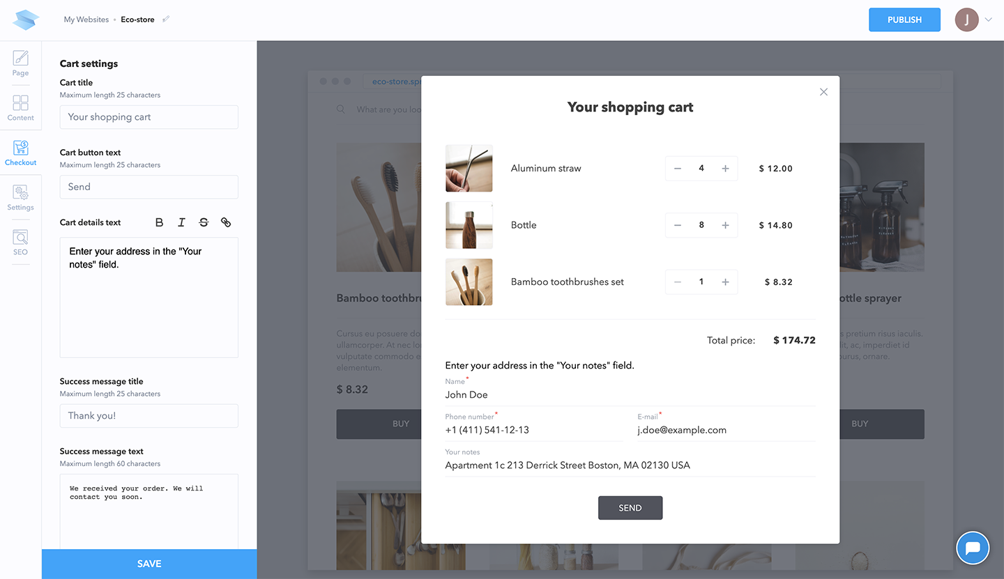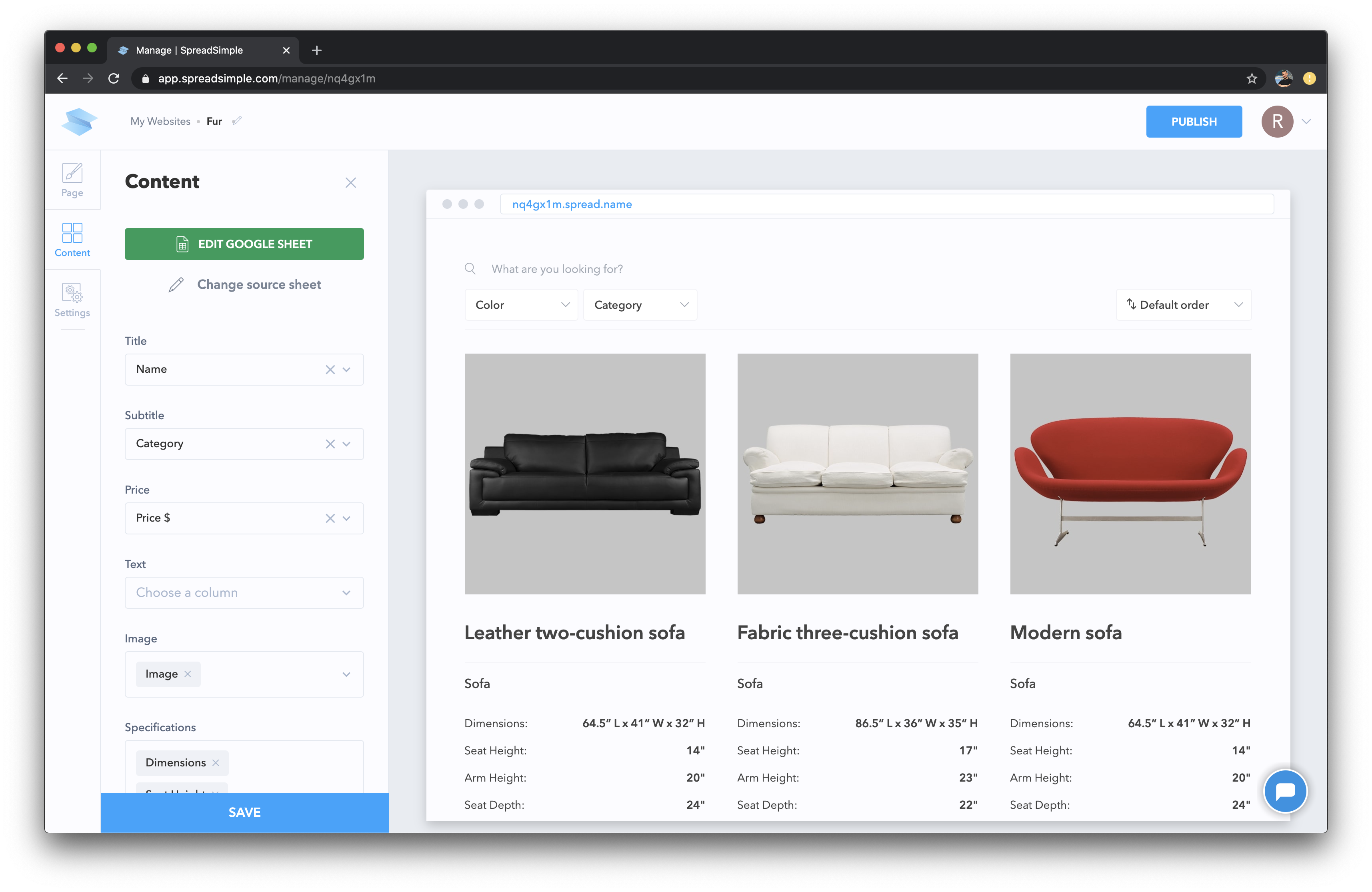 SpreadSimple uses the data in your Google spreadsheet to create styled websites with a variety of customisable features such as search, sorting, filtering, cart collection, SEO, custom scripts and others. SpreadSimple allows you to manage your website through a Google Spreadsheet requiring no code. The spreadsheet becomes the content management system and all the changes you make are instantly updated on your website.