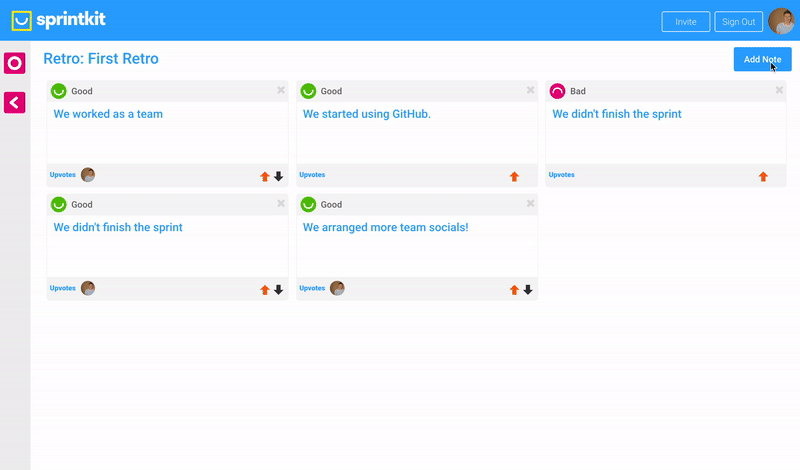 SprintKit helps teams work better together. A super simple and fun tool for running team retrospective sessions. Add notes about what is working well for your team, what isn't going so well and what actions you will take to make things better. Team members can then vote on what matters most to them. I built SprintKit for myself and teams I work with but have decided to open it up, would love to hear what you think!