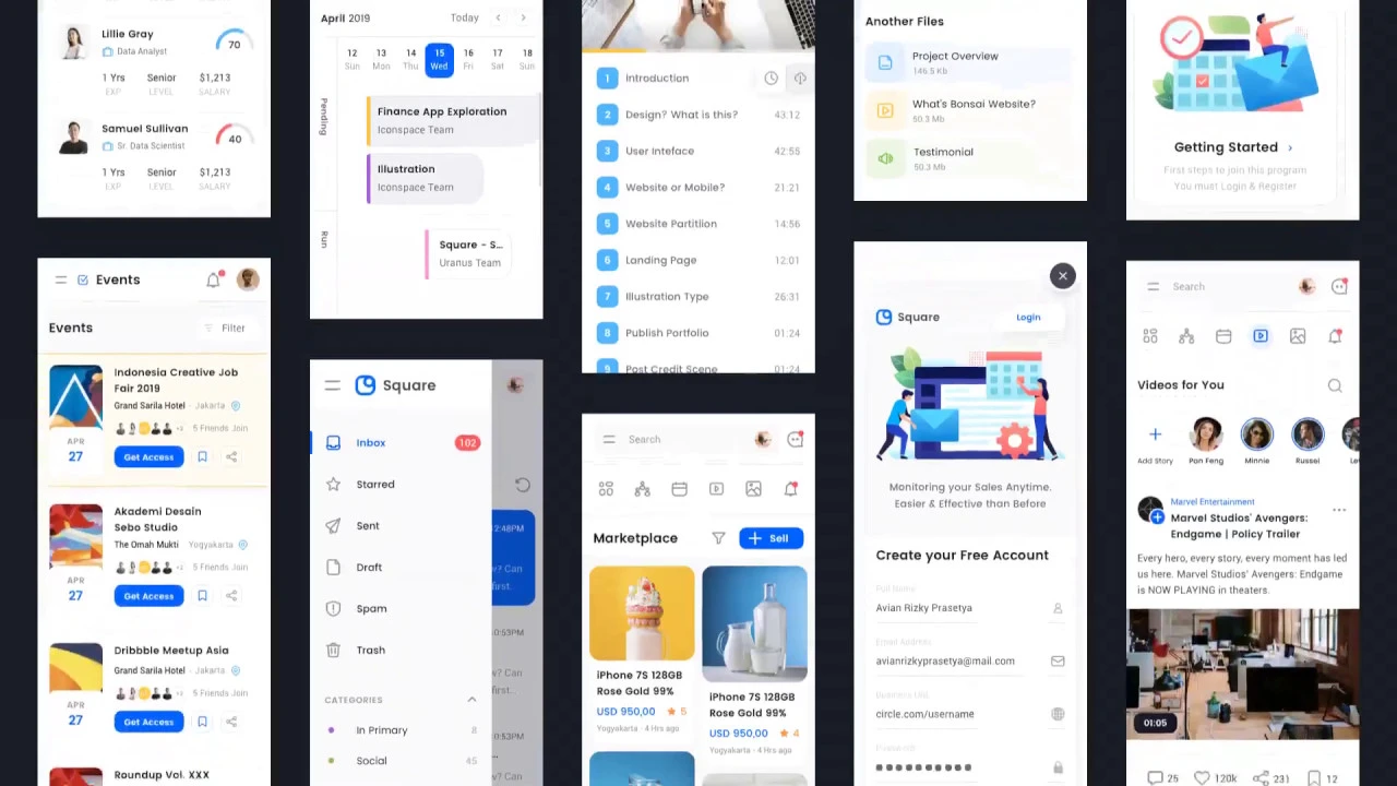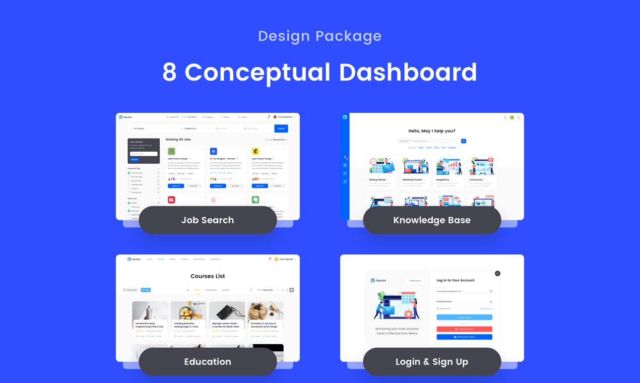 Square Dashboard UI kit Crafted with passion and deep precision. Available in various elements for the needs of Project Management, Messaging Platform, Social Media Analytics, Sales Analytics, Job Search, Knowledge Base, Education, and Signup/Login Form. Made with a unique style using rounded corner shape & modern color scheme. Make it looks dynamic and matches with the current and future design styles. With a total of 150 screens, 350+ symbols, and 30 text styles, it will help you create prototypes for the analytic dashboard you are working on. Created using shape layers, free Google fonts, and vector graphic images. Square comes in Sketch and Figma file format, you can easily combine it with other plugins. What's inside? ---------------------- - 65 Desktop Screens - 85 Mobile Screens - 350+ Symbols - 30 Text Styles - 8 Conceptual Dashboard Categories - UI Styleguide - Available in Sketch and Figma File Features ---------------------- - Retina ready - Vector Shapes - Free fonts used - Properly named layers - Organized structured layers - Lifetime Updates Screen Categories ---------------------- ? Project Management ? Sales Analytics ? Messaging Platform ? Social Media ??‍? Job Search ? Knowledge Base ??‍? Education ? Login & Sign Up Updates ---------------------- (Update 1.1) 31 June 2019 -- Updated! - 26 screens in mobile design. - Available in Figma. (Update 1.2) 31 July 2019 -- Updated! - 39 New Screens in Desktop - 56 New Screens in Mobile - UI Style guide (Update 1.3) 30 September 2019 -- Next Update. - Dark Mode in Desktop (65 Screens) - Dark Mode in Mobile (85 Screens) With ?? Iconspace Team
