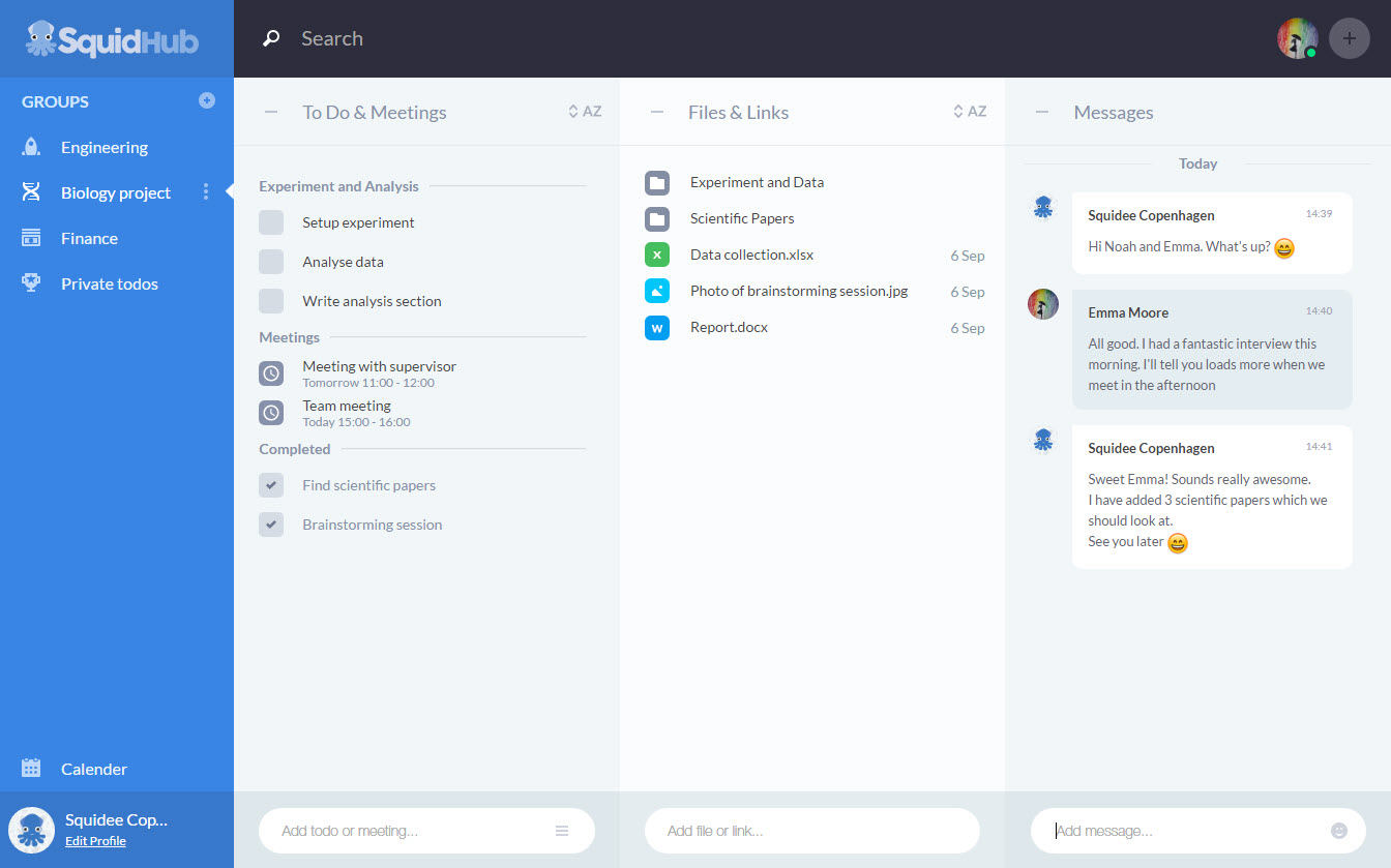 SquidHub is a simple to use, fun and flexible app for collaborating on anything with anyone. From complex projects with co-workers to birthday parties with friends. Organize your todos, files and communication for your entire project in a single screen. And get access to a shared calendar for all of your teams. SquidHub is integrated to both Google Calendar and Google Drive for ease of use. Say hello to clarity and goodbye to stress!