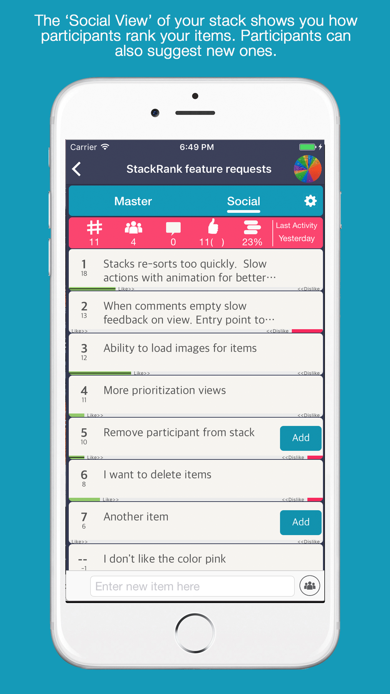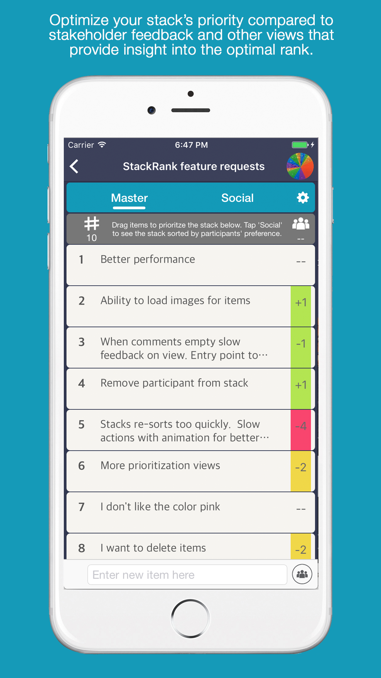 Give your customers what they want. StackRank makes it very easy to engage with your customers, partners, and stakeholders to get real-time feedback on the development of your business or product. Through the use of a proprietary, mobile-first, social, feedback engine; StackRank gives you the confidence you need to invest your resources efficiently to bring the right product to market.