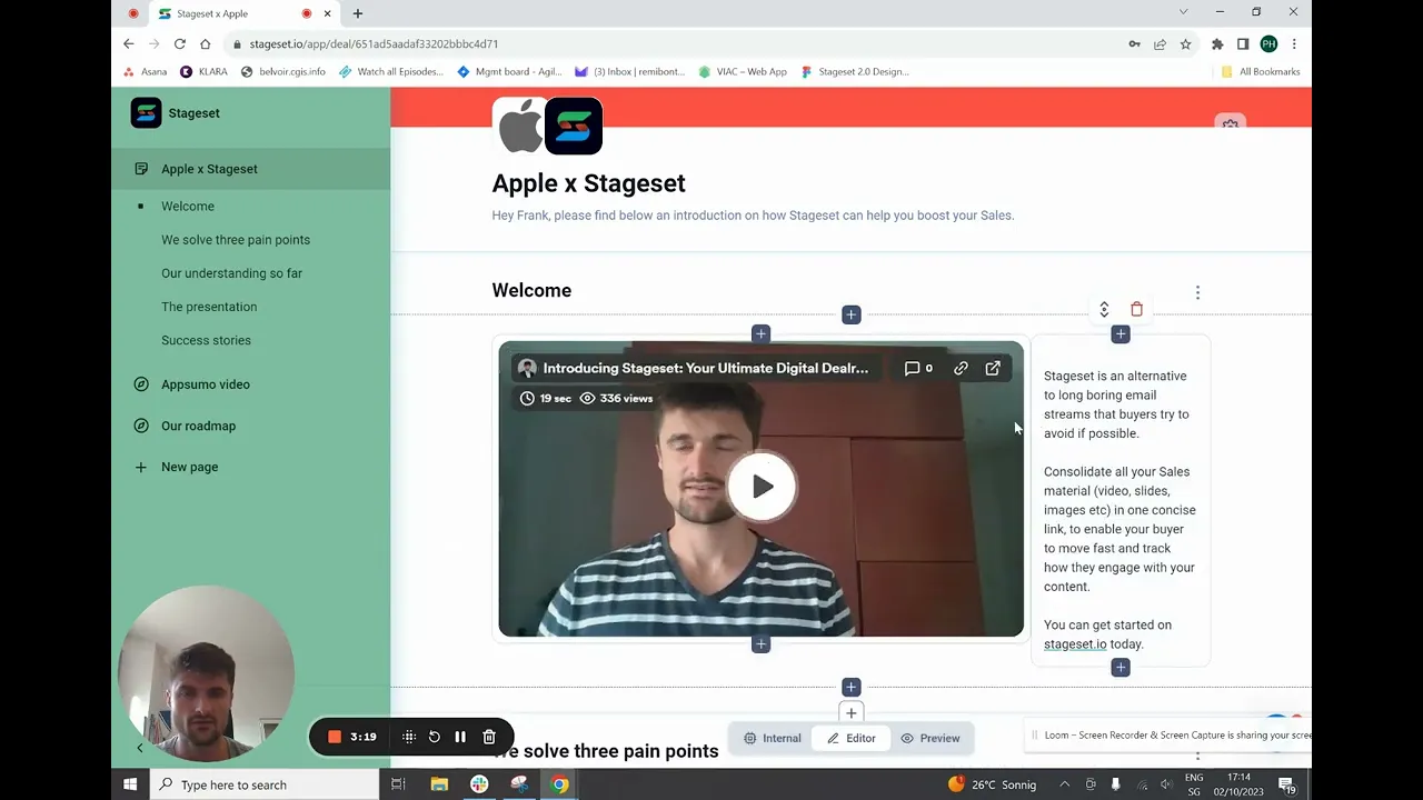 With Stageset, B2B Sales teams win more deals faster. By sharing everything their buyer need on one Stageset deal page, B2B sellers: - Reduce mails and meetings required to close a deal by half. - Empower their lead buyer to convince their team to buy their product - Get real-time engagement feedback of their buyers Get started to today with the free plan or book your meeting on stageset.io.