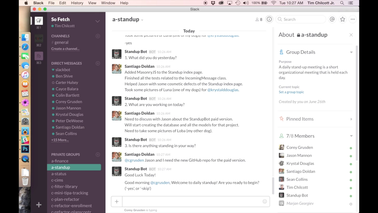 Standup meetings is the most effective tool for guiding teams to make consistent progress on projects and goals. Everyone is updated each day which means everyone hold everyone else accountable with 3 simple questions... 1. What did you do yesterday? 2. What are you doing today? 3. Anything stopping you? With Standup Bot, remote teams will save countless hours of task management data entry. Not only are we the most secure slackbot for standups, but we are also the fastest and easiest to get started! You'll be up and running within 2 minutes!
