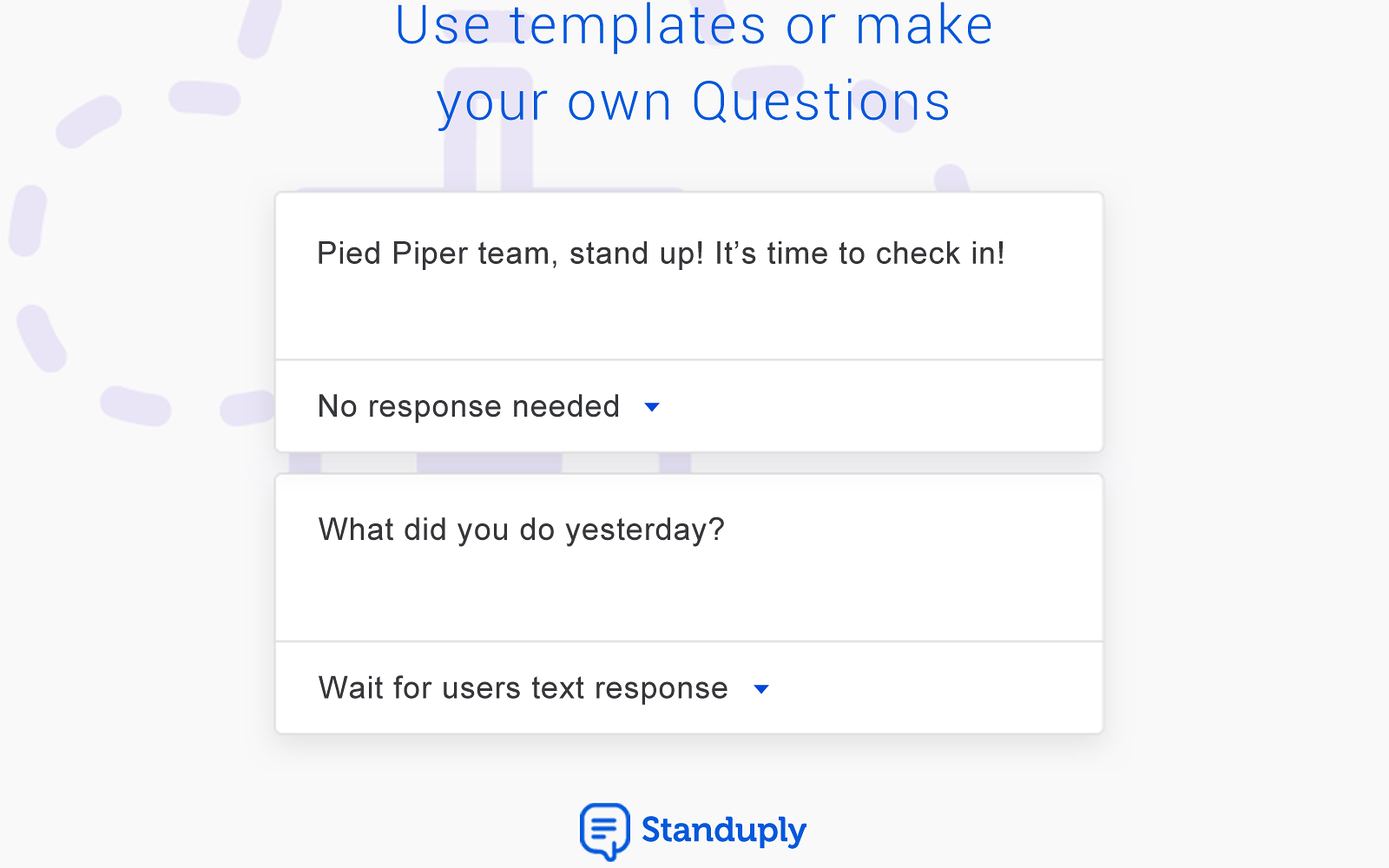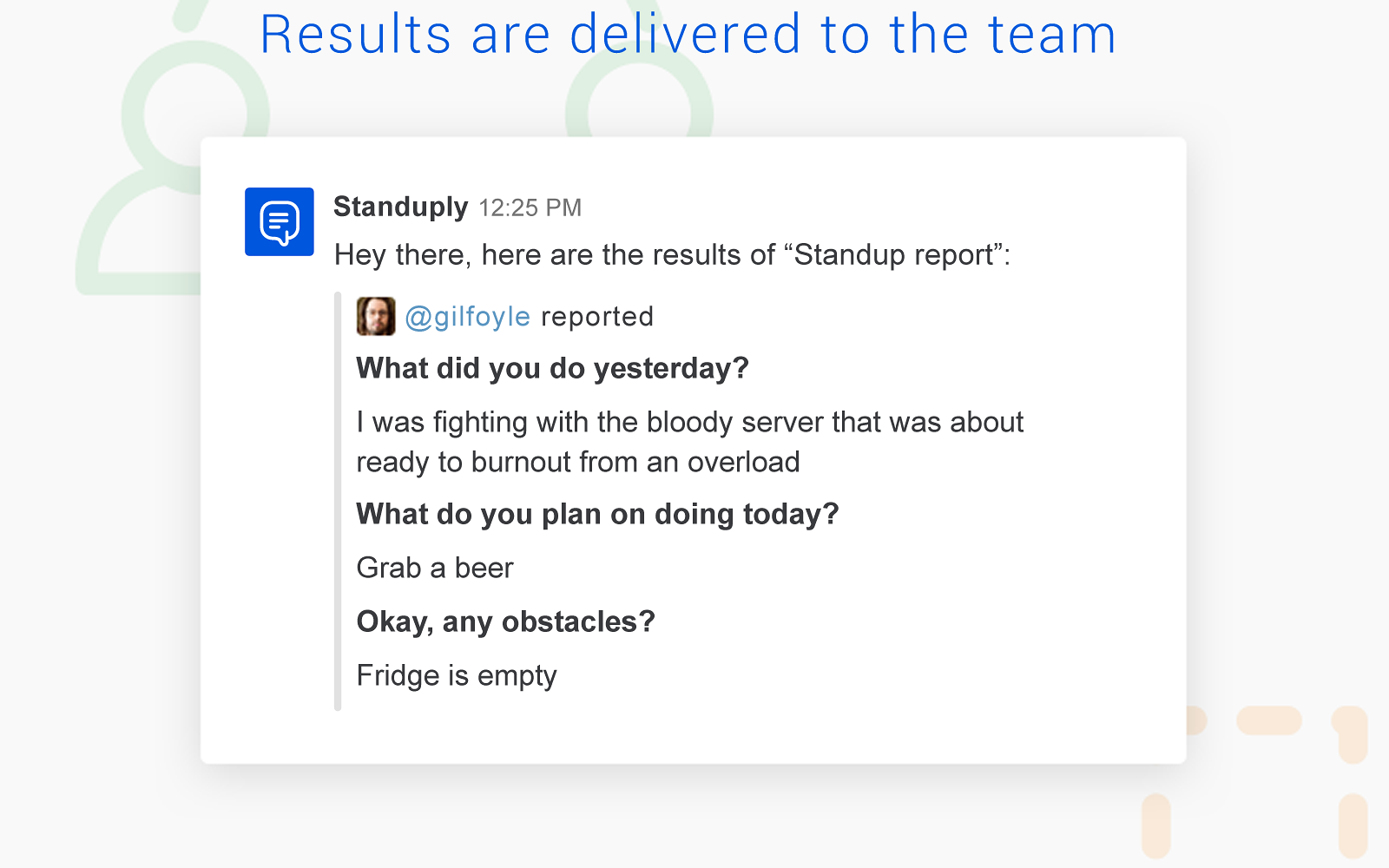 Standuply is a brilliant Slack bot running automated standup and retrospective meetings. — Schedule reports. Run multiple reports on a schedule or asynchronously. — In your language. Use predefined templates or make your own questions. — Threads support. Standuply puts answers in a channel or within a thread. — Quick responses. Every question comes with a dropdown menu for a quick reply. Standuply is integrated with the task trackers: Asana, Trello, Pivotal Tracker, JIRA, Redmine, Wrike, Basecamp (via Google Chrome extension). The other integrations are to come: Salesforce, Trello, Stripe, Google Analytics, GitHub. Use custom request (upcoming feature) to extract data directly to Slack from databases: MySQL, MongoDB, PostgreSQL, Oracle, Cassandra, Redis, Elasticsearch, DB2, etc. Standuply increases productivity of your team when time zone differences stand in the way. Proven by 2500+ teams.