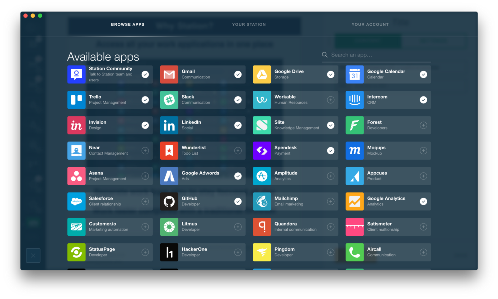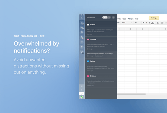Station is the first smart workstation for busy people. A single place for all of your work applications. -Keep your work nicely organized. -Find what you need in a heartbeat. -Stay ahead of the game. -Stay focused all day long. And night.