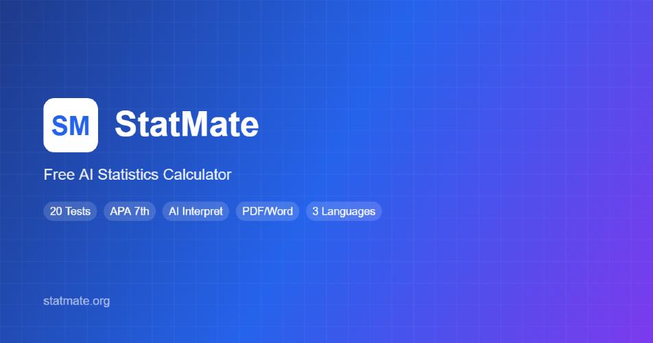 StatMate is a free online statistics calculator that instantly formats results in APA style. Built for students, researchers, and academics who need quick, accurate statistical analysis without expensive software like SPSS. Key Features: - 20 statistical calculators (t-test, ANOVA, chi-square, correlation, regression, and more) - Automatic APA 7th edition formatting - PDF export for all calculations (free) - AI-powered result interpretation (Pro) - Word/DOCX export with APA tables (Pro) - Data visualization with interactive charts - CSV/TSV file upload support - Trilingual: English, Korean, Japanese - Works on any device — no installation needed Perfect for thesis writing, coursework, and research papers. Calculate statistics, get APA-formatted results, and export directly to your paper in seconds.