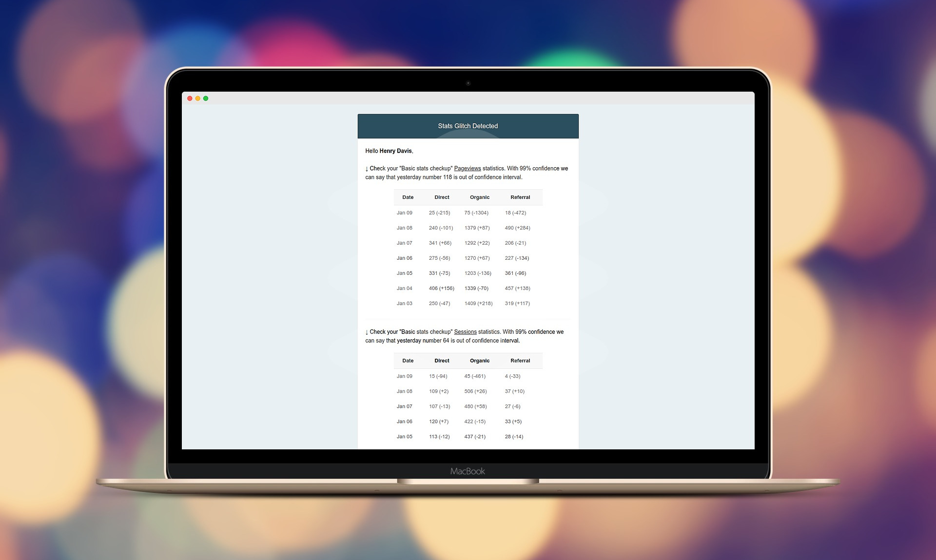 StatsGlitch removes the pain from daily checking of your Google Analytics stats. Less time wasted = more exciting things to do. * For Solo Founders/Blog Owners - use a free plan and available presets for setting up the most common traffic alerts. We all have side projects which we care about, but can't dedicate enough time, especially for investigating traffic glitches. Setup once and you won't miss your next week-long outage (true story), or a mention on social media which drove you a ton of lost traffic. * For Startups - I'm sure you already have a vision of which metrics matter to you. Setup a custom or real-time alerts to track your referrals, goal completion, or bounce rate. Keep an eye on basically everything you can track via Google Analytics. Automatically forward alerts to responsible people in your team or even setup a webhook. Merely being aware of your traffic already places you higher than your competitors. * For Agencies - the pain of continually maintaining clients projects is overwhelming enough, not to mention monitoring their Google Analytics. Add the most important alerts to your clients once, and forget that pain. You can be sure, that StatsGlitch will notify you if something "weird" will happen. Maintain all clients alerts under one roof and finally take full control. * For Everybody - if daily or real-time alerts are not a massive thing for you, StatsGlitch has one more thing to offer. You can setup a weekly overview report and always stay informed about your most important metrics in a non-intrusive way. Receive a traffic/goals report once a week, nothing more, nothing less.