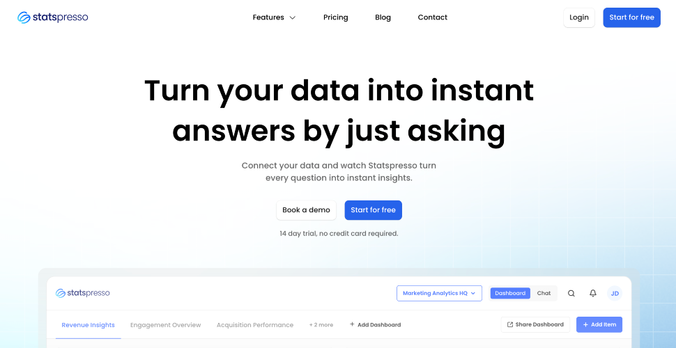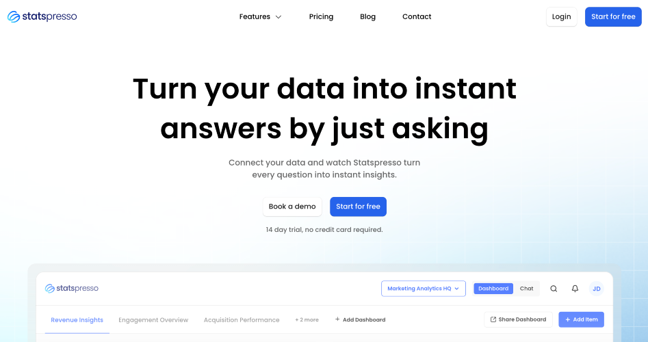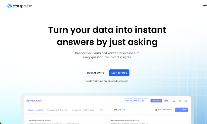 Statspresso is the next generation of Business Intelligence, designed to turn complex data into immediate, actionable insights through conversational AI. Founded on the principle that data should be accessible to everyone—not just analysts—Statspresso allows users to "chat" with their business data using natural language. By connecting seamlessly to a vast ecosystem of data connectors—including SQL databases, Stripe, Shopify, and popular SaaS APIs—Statspresso eliminates the need for manual dashboard building and complex query languages. Simply ask a question like "What was our MRR growth by region last month?" and receive instant, accurate visualizations and reports. In the fast-paced landscape of 2026, Statspresso empowers teams to move from data-heavy to data-driven in seconds. We are bridging the gap between raw information and human decision-making, ensuring that every team member, from marketing to C-suite, can unlock the power of their data through simple dialogue.