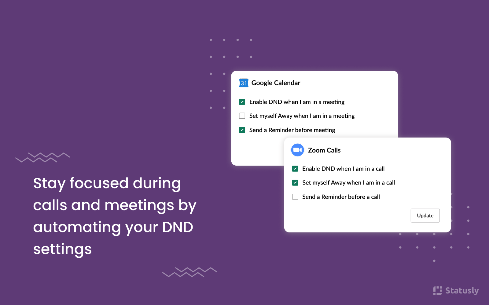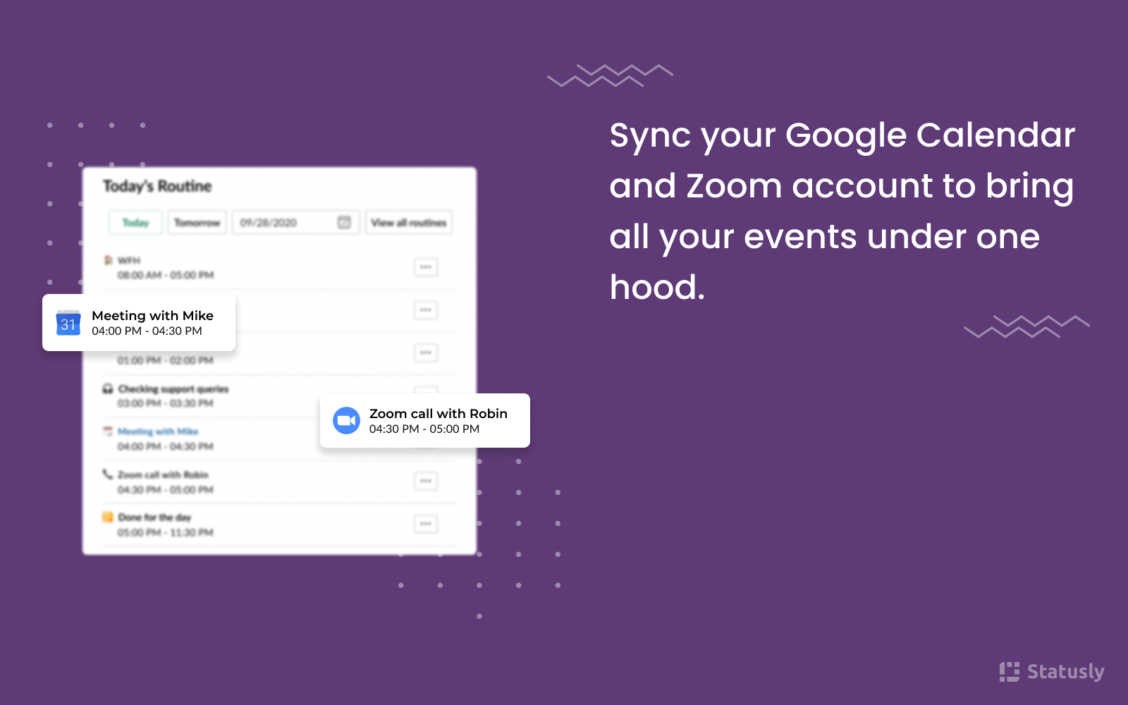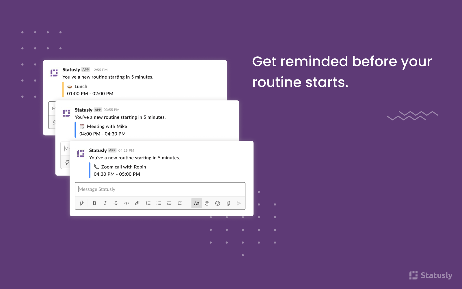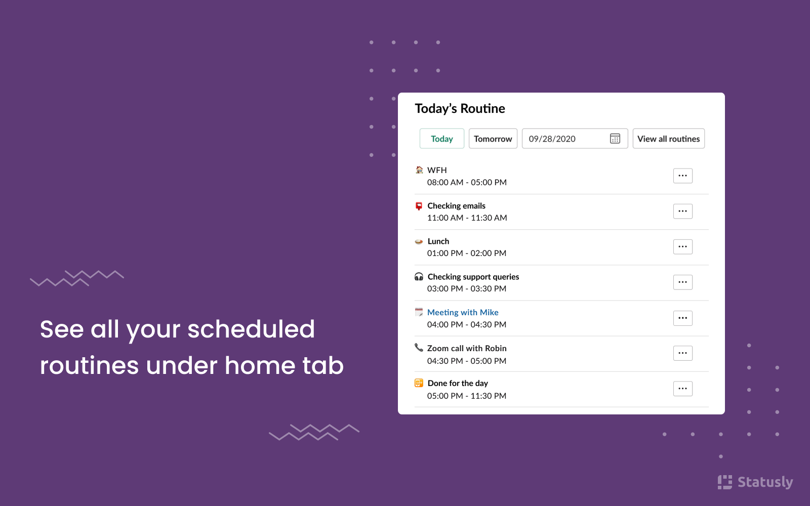 Statusly is a Slack bot that helps you automate your Slack status and DND/away settings with Powerful Routines. Features : • Create routines based on your daily activities. • Sync your meetings on Google Calendar and automatically switch to DND to have hassle free meeting. • Sync your Zoom account and attend calls without any distraction while we automatically activate your DND settings. • See all your scheduled routines under home tab. • Get reminded before your routine starts. Try your 14 day free trial with Statusly now, for more details check our pricing https://www.statusly.app/pricing