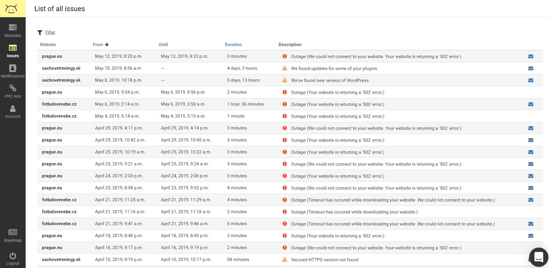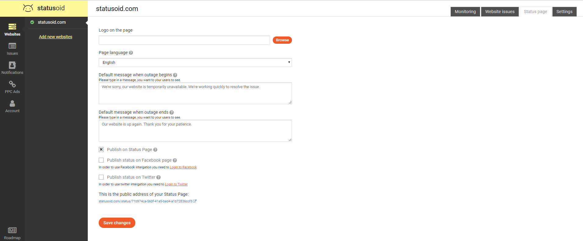 Statusoid is a easy to use, responsive and proactive website monitoring solution for online businesses. What makes Statusoid stand out are his advanced features and friendly approach to non-technical audience. Statusoid can pause and resume your online campaigns when outage happens and keep your audience informed by automatic social media notifications! With our security and performance checklist you are able to fix problems before they cause any harm. Our security monitoring tool aims at digital marketing agencies, eCommerce sites or for any website owner who values security and performance of his website. With instant notifications you will always know when something goes wrong. Statusoid operates a worldwide network of servers which checks your website every 30 seconds from over 15 worldwide locations. Statusoid has integrated public status page which can send Facebook and Twitter message automatically to your audience to keep everyone informed.