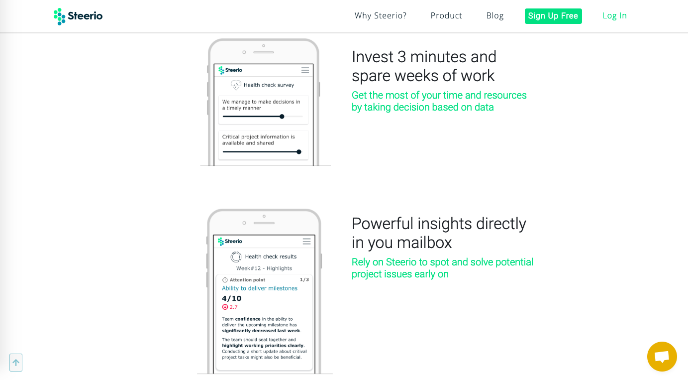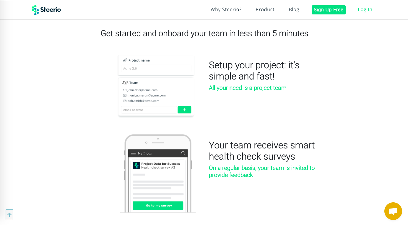 Steerio - Make better project with your team and deliver great project work! Steerio is a smart consultant that leverages team feedbacks to augment project capabilities and collaboration. Our platform leverages smart analytics to monitor how you project is doing, identify what can be improved and provide advices to solve issues proactively. How does Steerio works: > Every week, Steerio will send short targeted survey (health check) to you project team. > All it takes them is 3 minutes to provide a valuable feedback to the project. > Our algorithm analyses health check results and generates smart analytics about the project situation. > For busy managers, we generate smart project summaries and send it directly into your mailbox. As a result Steerio enhances your collective awareness, reinforce team engagement and help you to deliver successful project work. What to know more about our smart consultant: visit steerio.co and start using Steerio for free!
