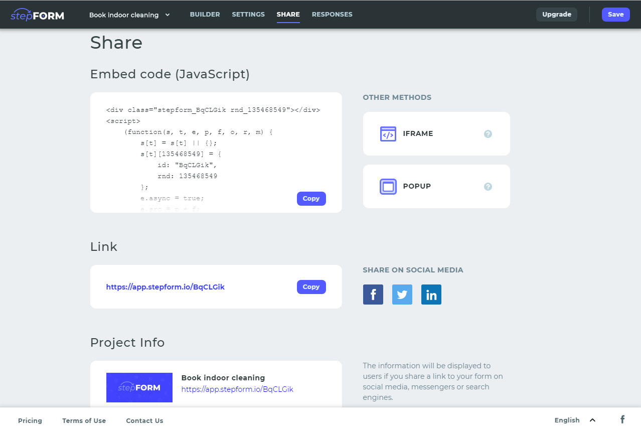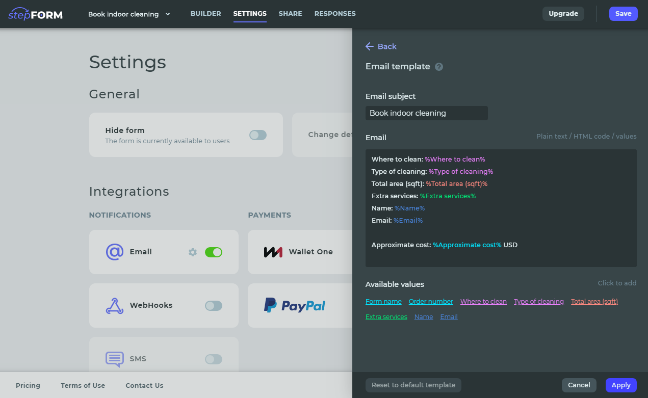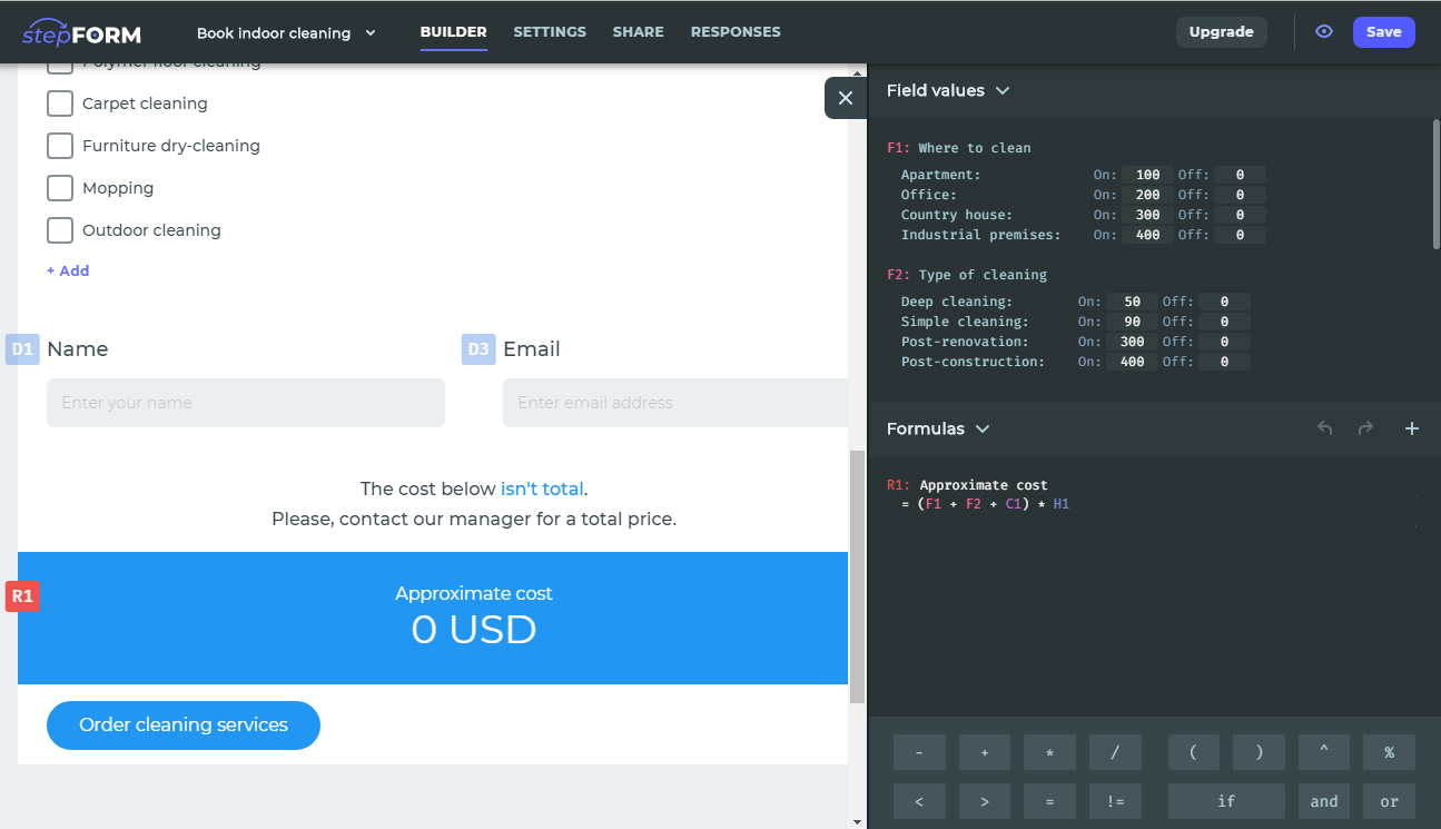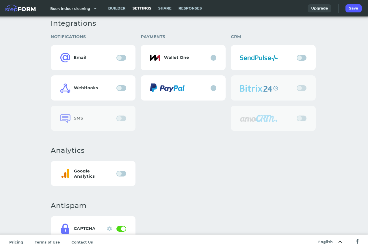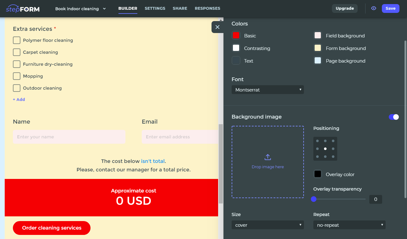 stepFORM is a builder for creating order forms, online surveys and quizzes. With its help, you can collect clients’ contact data, carry out marketing polls, offer instant quotes for your services. Features: - Free subscription - Visual editor with 15 basic elements - Get orders to your inbox and send email auto-replies to clients - Collect responses in the internal CRM system - Use forms on your site or share a link to a form via social media and messengers - Responsive view — forms look great on mobile devices and tablets - Integrated payment collection methods — PayPal and Wallet One - Google Analytics integration - Antispam protection - Calculation of services’ costs according to predefined formulas - Custom HTML code injection - WebHooks mechanism The service is targeted at small businesses to empower them to create forms and surveys on a budget without hiring specialists.