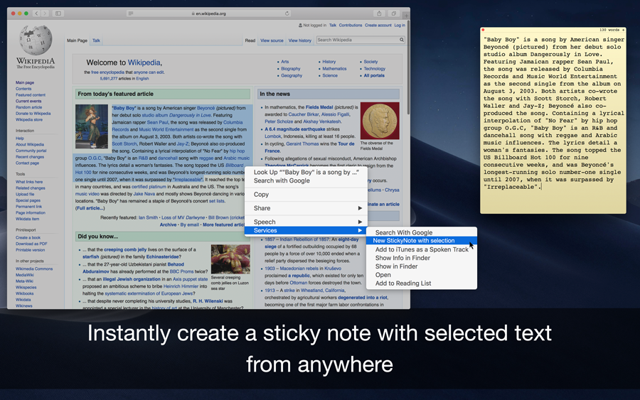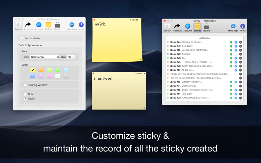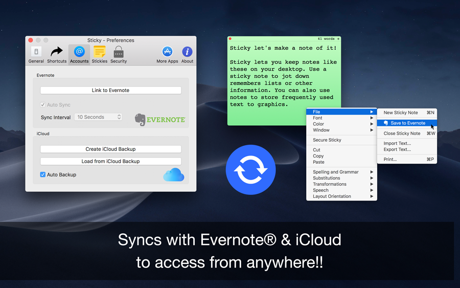 Welcome to Sticky Notes App The Sticky Notes app uses your Evernote & iCloud space and to sync notes between the Evernote account. It cannot access your private files only those created by itself. Import & Export notes online with one click, with easy & customizable sticky notes in different colors, feel free to move and resize your notes independently. Supports multiple languages with text to speech recognition and can lock individual sticky notes with touch ID unlock. Sticky Notes use Official Evernote API to sync the sticky notes from and to Evernote account.