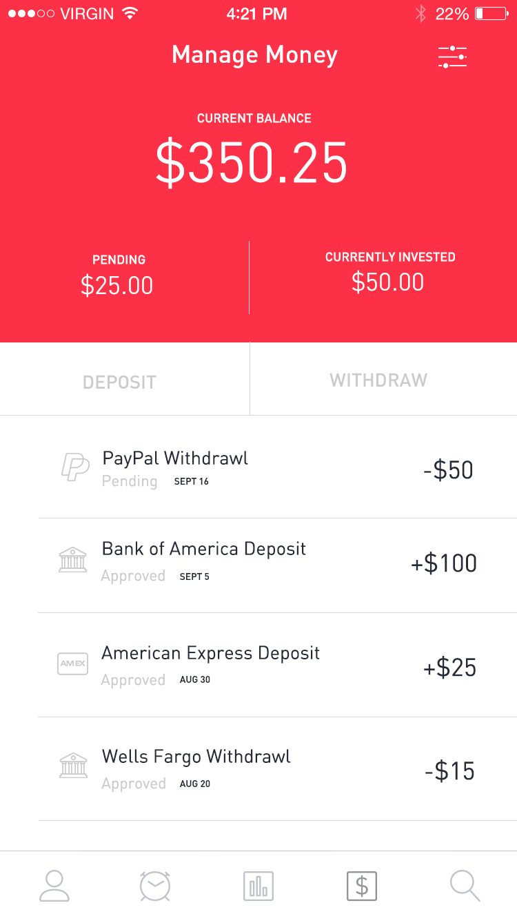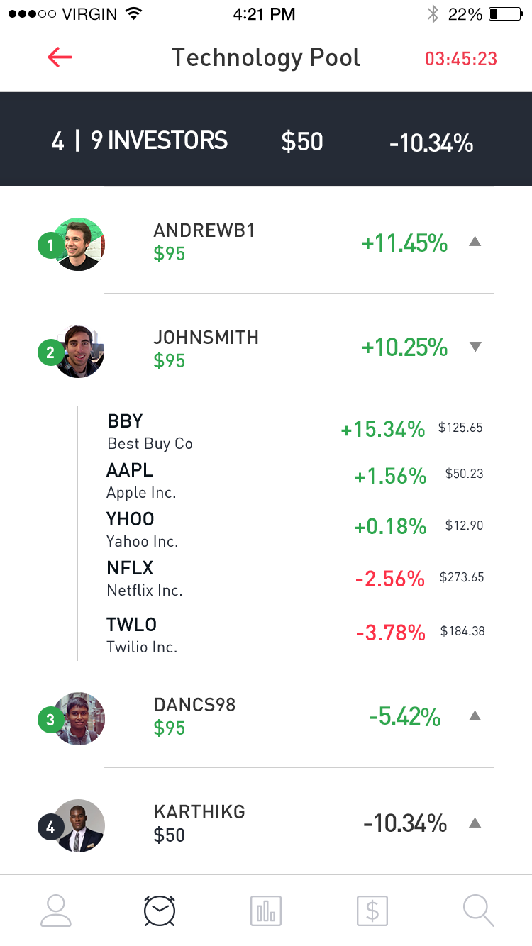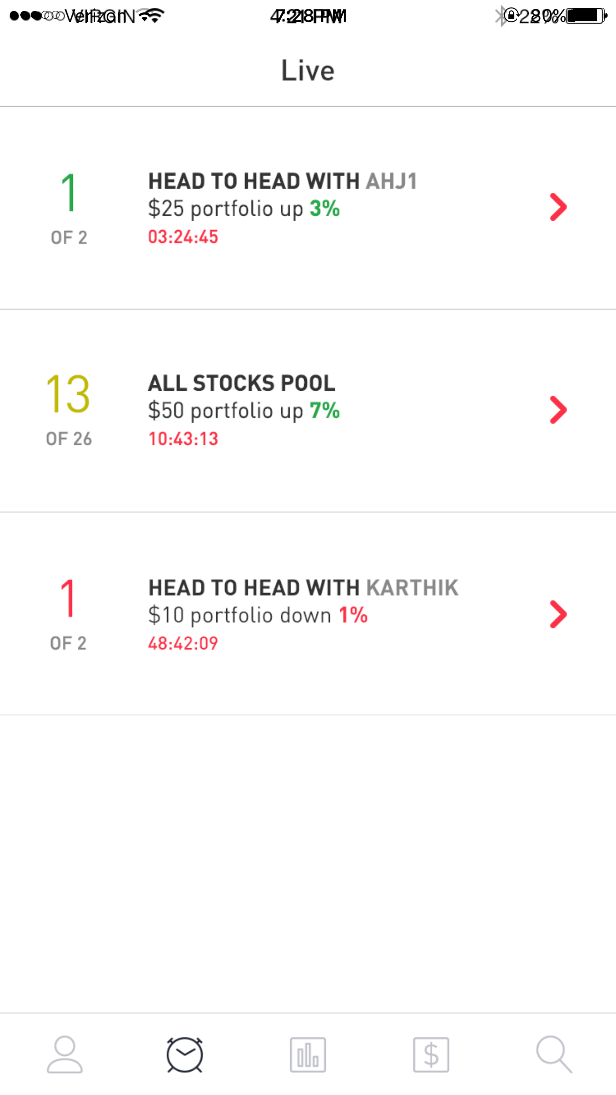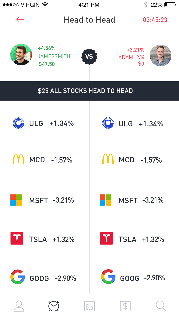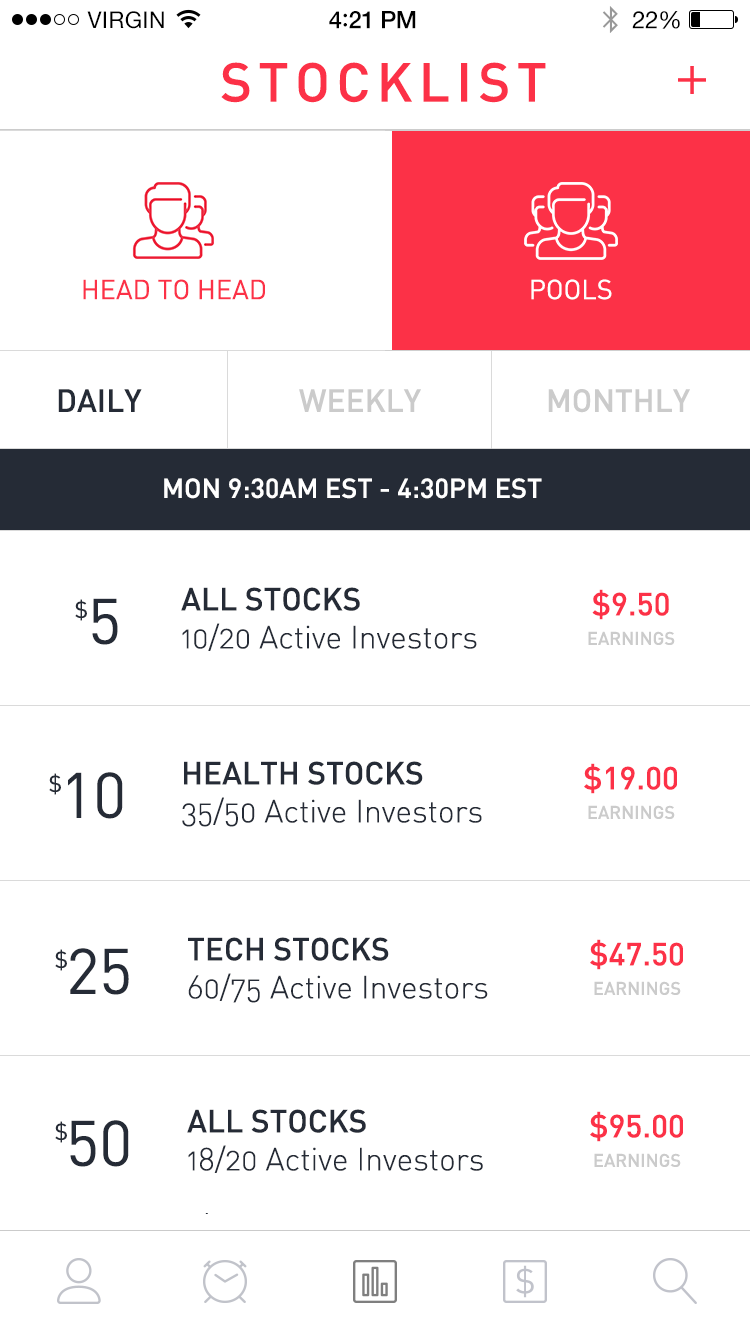StockList is an entry level trading platform for people bet against each other instead of the market. Our mission is to help ordinary people learn and earn in the financial markets! For example, 2 investors may enter a head to head where they create a portfolio of 5 stocks. Each investor may put in $50 - the investor with the better performing portfolio earns $97.50, StockList earns $2.50 commission, and the investor with the lower portfolio loses their principal. Users can also mitigate risk by entering pools where they compete against multiple investors. In a pool, the top third makes a 95% return, the middle third gets their principle back and the lower third loses their principle.