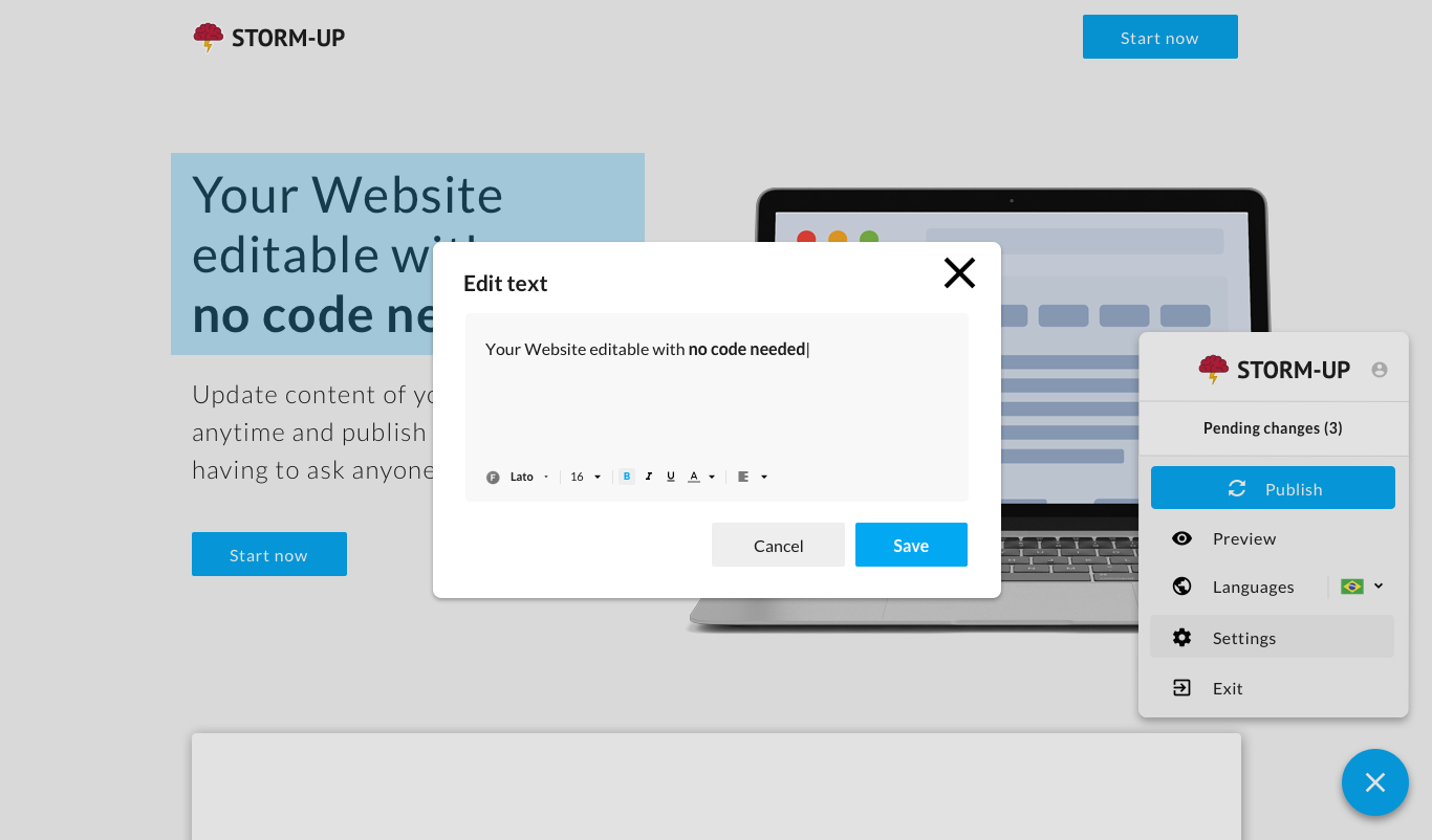 Storm-up is a plug and play platform that makes any existing website editable. Imagine that you could take features from Wix/Wordpress and plug them into your existing website, without having to change a single line of code. Also you can Auto-translate to any language, manage leads, improve SEO and more! Sign up to know more!