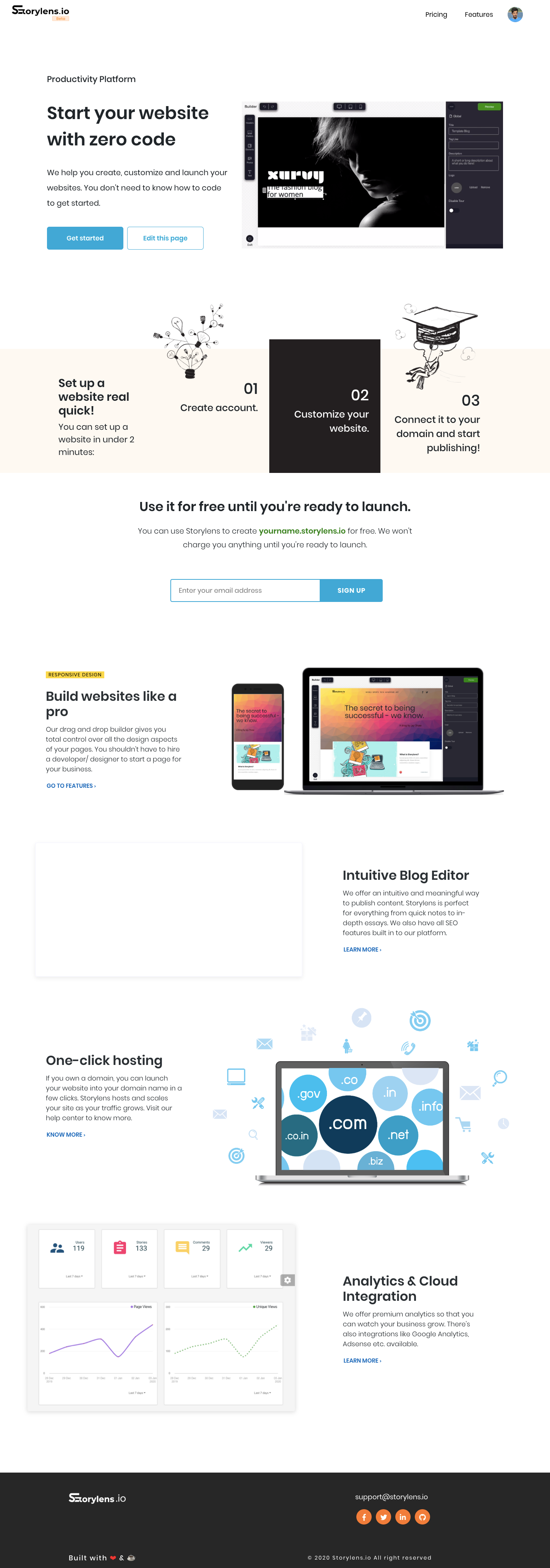 Storylens helps you build a fully functional website/blog without writing any code. Our aim is to create a platform where users can drag and drop UI elements/components and create beautifully crafted web applications. In our opinion, you should have more control over how your website looks like and it's high time that visual programming takes over. In that direction, we wanted to create a platform where even technically challenged users can create something beautiful. Right now, you can actually create blogs using our platform. TL;DR: You shouldn't need to hire developers to start a business website/portfolio.