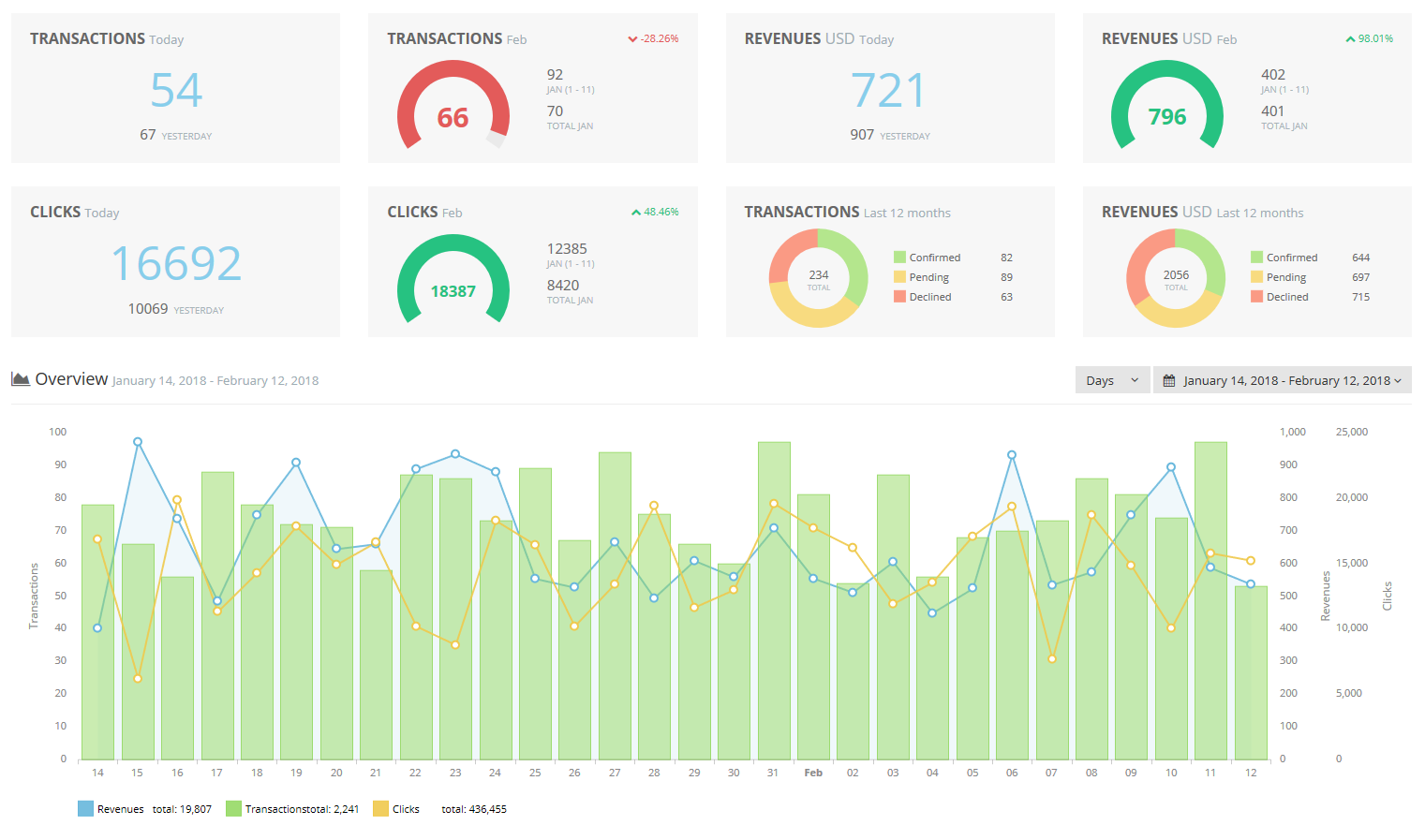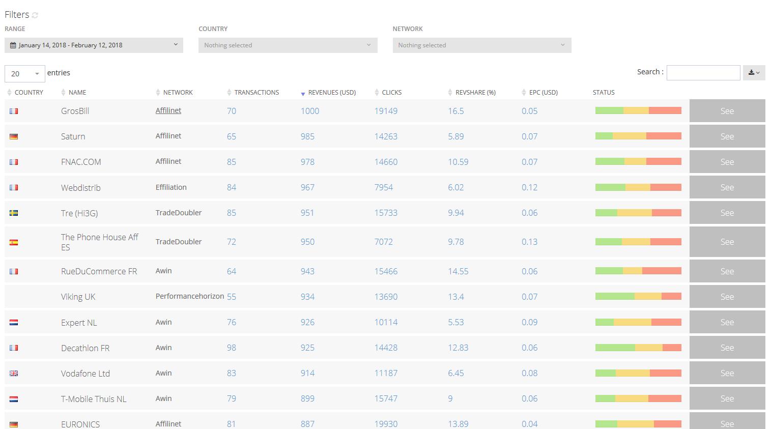 Strackr helps you to monitor and track affiliate data from platforms like Awin, Affilinet, Tradedoubler or Amazon. Your all-in-one dashboard who gives you access to transactions/leads, revenues or clicks and metrics like CPC, Revenue Share or CTS to compare your performance. How it works? You connect platforms and Strackr does the job!