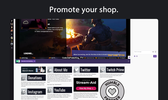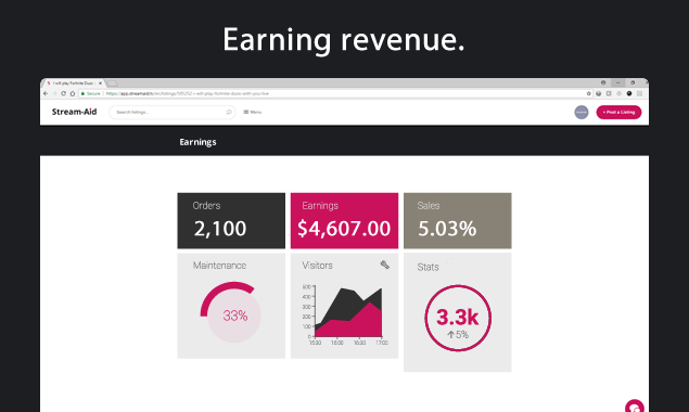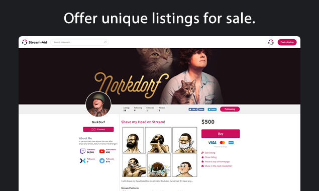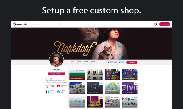 Stream-Aid is an Innovative Monetization Platform for Live Streamers. Setup a custom shop and offer unique experiences your viewers can buy to help support your stream. Go beyond typical monetization and engage with your viewers on a deeper level while you earn additional revenue. Stream-Aid can be used with any streaming service e.g. Twitch, YouTube Gaming, Mixer, Facebook Live, Caffeine, as well as other streaming services.