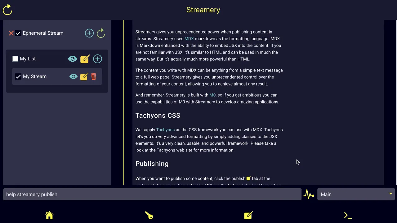 Streamery generalizes the concept of a feed or timeline into what we call a stream. Anyone can create a stream and publish content to the stream. The creator has complete control over the contents of the stream. A stream can be monetized in a variety of ways. Other users can subscribe to streams to see the content published to that stream. Streamery is real time, in that published content is seen by subscribers immediately. Streamery content is unrestricted in size, and is designed with MDX, a supercharged version of Markdown. Anything from simple messages to full web page designs can be expressed with MDX. This greatly expands the use cases for Streamery.