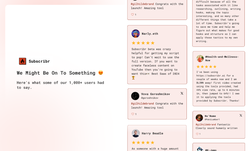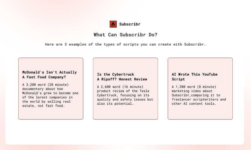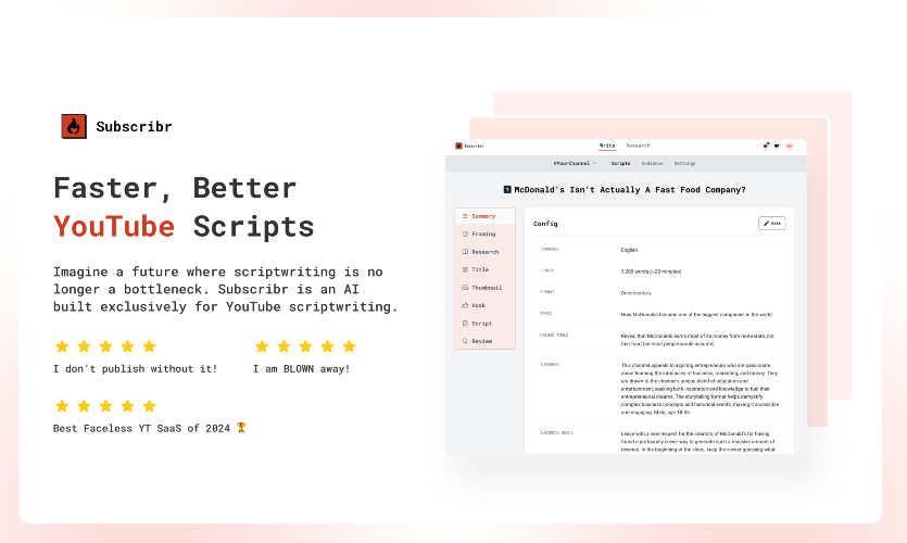 Subscribr is an AI-powered scriptwriting tool built exclusively for YouTube creators. It's designed to help you create high-quality, engaging video scripts in a fraction of the time it usually takes, so you can focus on delivering great content to your audience. With Subscribr, you can: Quickly generate ideas for titles, hooks, and video outlines Conduct in-depth research on any topic with just a few clicks Remix proven viral video scripts to create your own unique content Get instant feedback and suggestions to refine your scripts Collaborate with your team and integrate with your favorite tools Whether you're a solo creator or part of a larger team, Subscribr simplifies your scriptwriting process and helps you consistently produce top-notch content that resonates with your audience. Imagine the power of having a superhuman scriptwriting partner that deeply understands YouTube and is always ready to help you take your channel to the next level. Say goodbye to the stress and frustration of scriptwriting in 2024. With Subscribr, you'll be able to create more videos, faster than ever before, while maintaining the high quality your viewers expect. Subscribr will help you unlock your channel's full potential and dominate your niche.