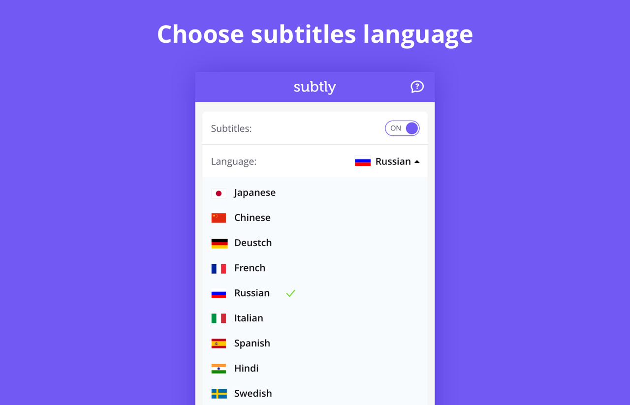 Subtly is a browser extension that provides a unique opportunity to learn English while watching your favorite movies and TV shows with subtitles. Today Subtly provides you with: - 9 languages into which you can translate the subtitles, including Chinese, French, German, Hindi, Italian, Japanese, Portuguese, Russian, Spanish