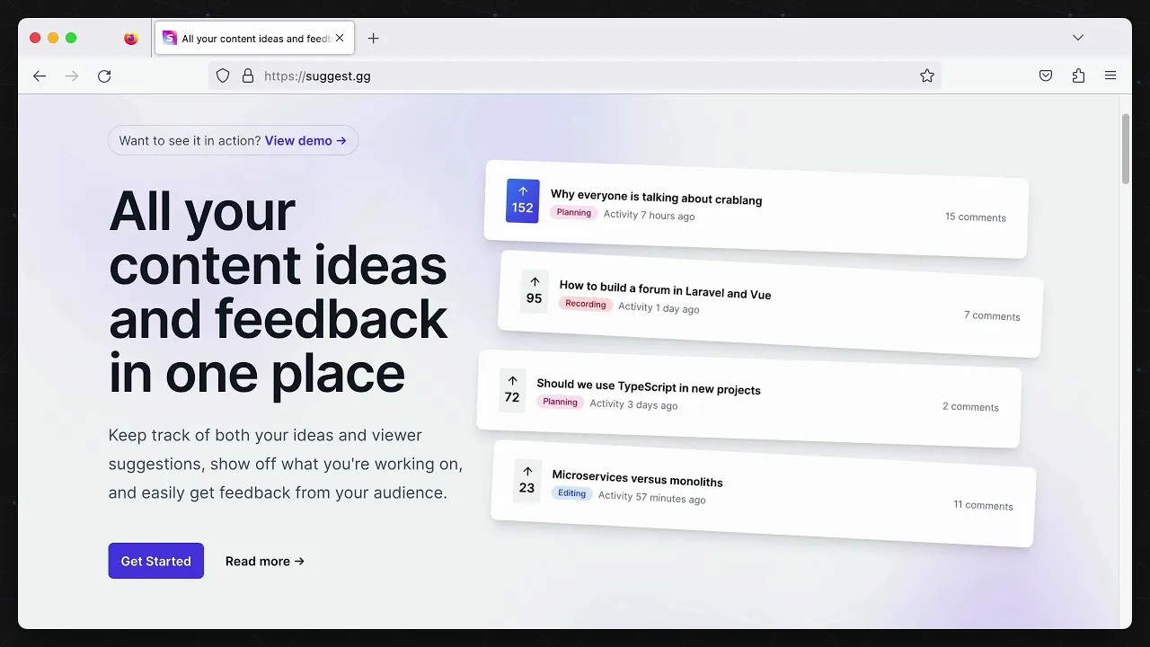 Suggest.gg lets content creators keep track of their upcoming projects and suggestions. With a public profile, you can let your audience decide what projects they're most excited for, or want to see published next. Your viewers can leave you feedback in the form of votes or comments, and give you suggestions using a message box on your profile page. Think of it like a roadmap app for content creators. Suggest.gg is 100% free and comes with unlimited ideas, votes, suggestions, and views. You can choose to have only registered users interact with your page, or open it up to anyone anonymously! It's perfect for any and all content creators, like YouTubers, streamers, product reviewers, artists, writers, bloggers, and more.