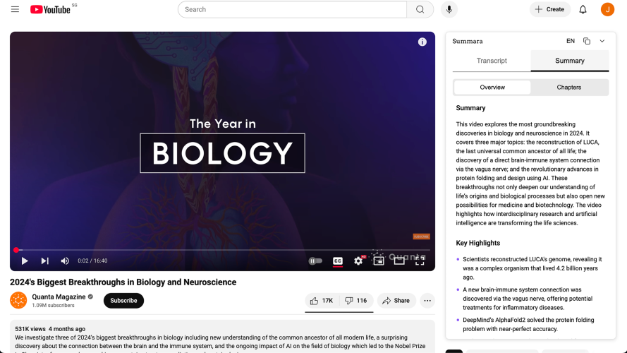 Summara is a Chrome extension widget that instantly generates AI-powered summaries of YouTube videos, helping users save time and learn more efficiently. The widget features a smart transcript reader, making it perfect for students, researchers, and content consumers. The widget offers a seamless experience that integrates into YouTube and transforms how users interact with video content by providing instant insights and key takeaways. Key Features - YouTube AI Summaries: Generate instant AI summaries and extract key insights from the video that saves you time - YouTube Video Chapters: Breakdown videos into timestamped chapters, allowing you to easily skip to sections you care about - YouTube Transcript Reader: View the full video transcript in segmented blocks and easily copy the raw transcript - Light & Dark Mode: Widget supported in both Light and Dark mode theme options Benefits - YouTube AI Summaries: Substantially save time watching and browsing through YouTube videos by extracting just key information from the video - YouTube Video Chapters: Take the guesswork out of jumping to sections of the video you care about - YouTube Transcript Reader: Easily read along with the video at high speed with the transcript reader. Gain access to transcripts in 100+ language options Use Case Summara serves as a versatile learning and productivity tool for students, researchers, content creators, and professionals. Students and researchers can efficiently extract key concepts from educational videos and lectures, while content creators can quickly gather information and quotes for their articles. Professionals benefit from accelerated learning of new skills and industry trends through AI-generated summaries and adjustable-speed transcript reading. With support for over 100 languages, Summara enables efficient knowledge acquisition across global educational resources, making it an essential tool for anyone looking to optimize their video-based learning and research workflow.