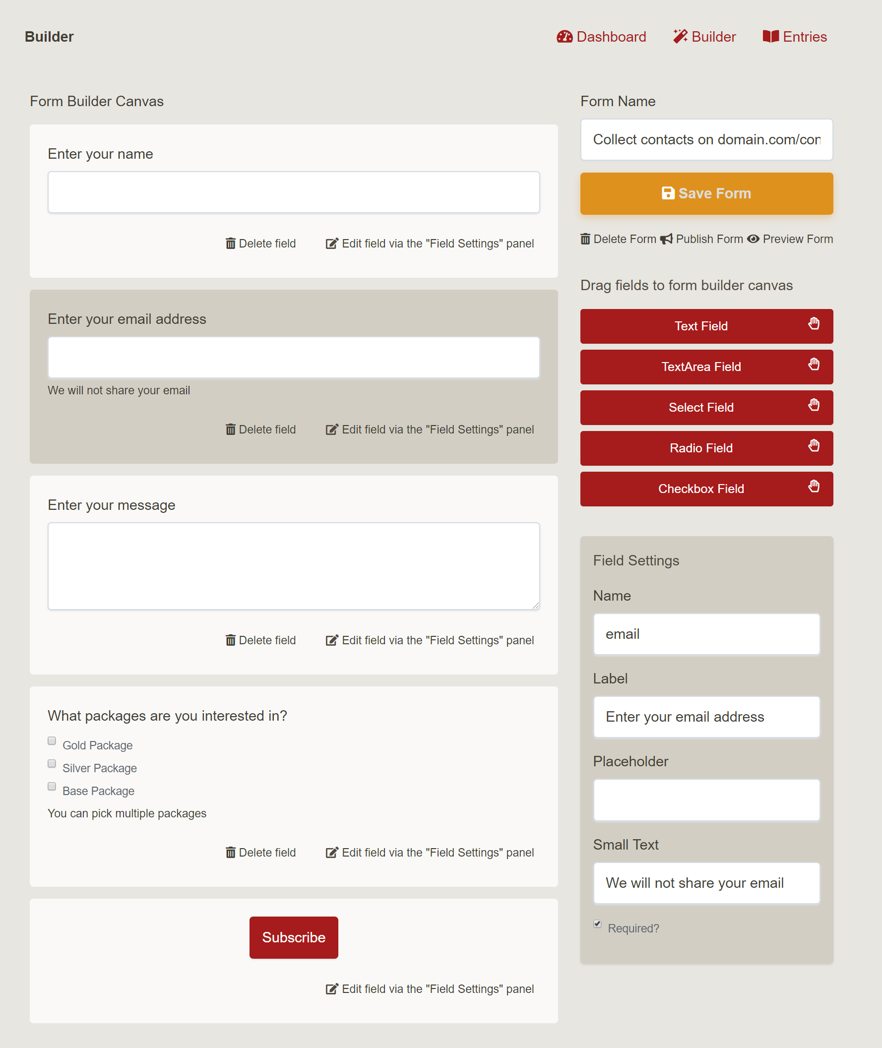 Thank for you checking out SummitForm, a simple SAAS app that I recently built . I needed a form builder tool that was simple and quick to use as well as affordable. I use SummitForm on my own websites to capture form entries and so far I like it ;). Please give it a try and let me know your thoughts. I am open to suggestions and any feedback to improve the product.