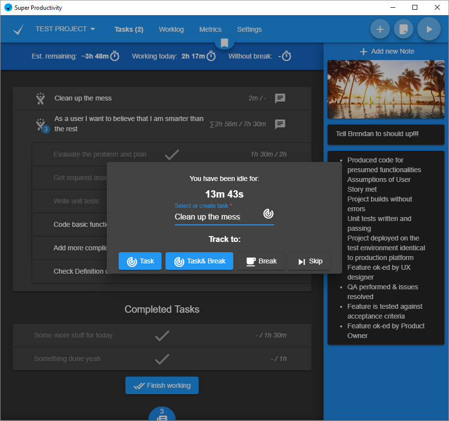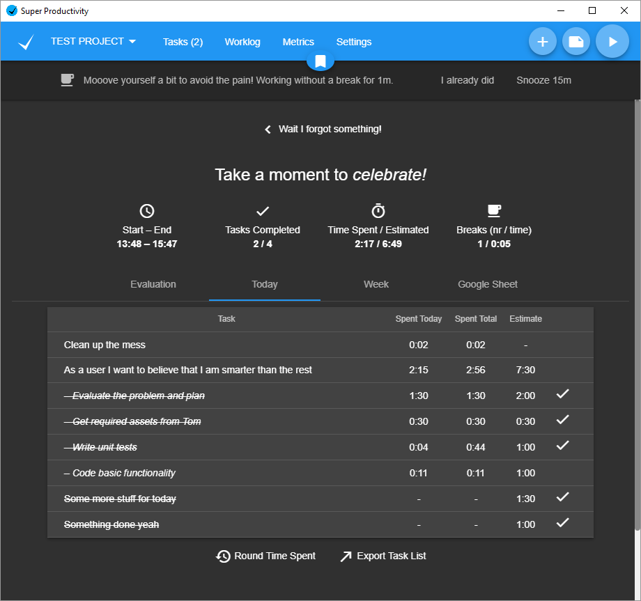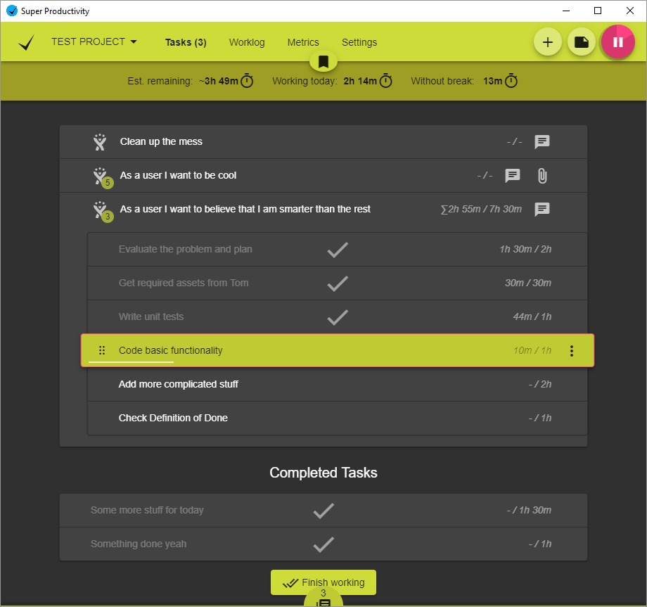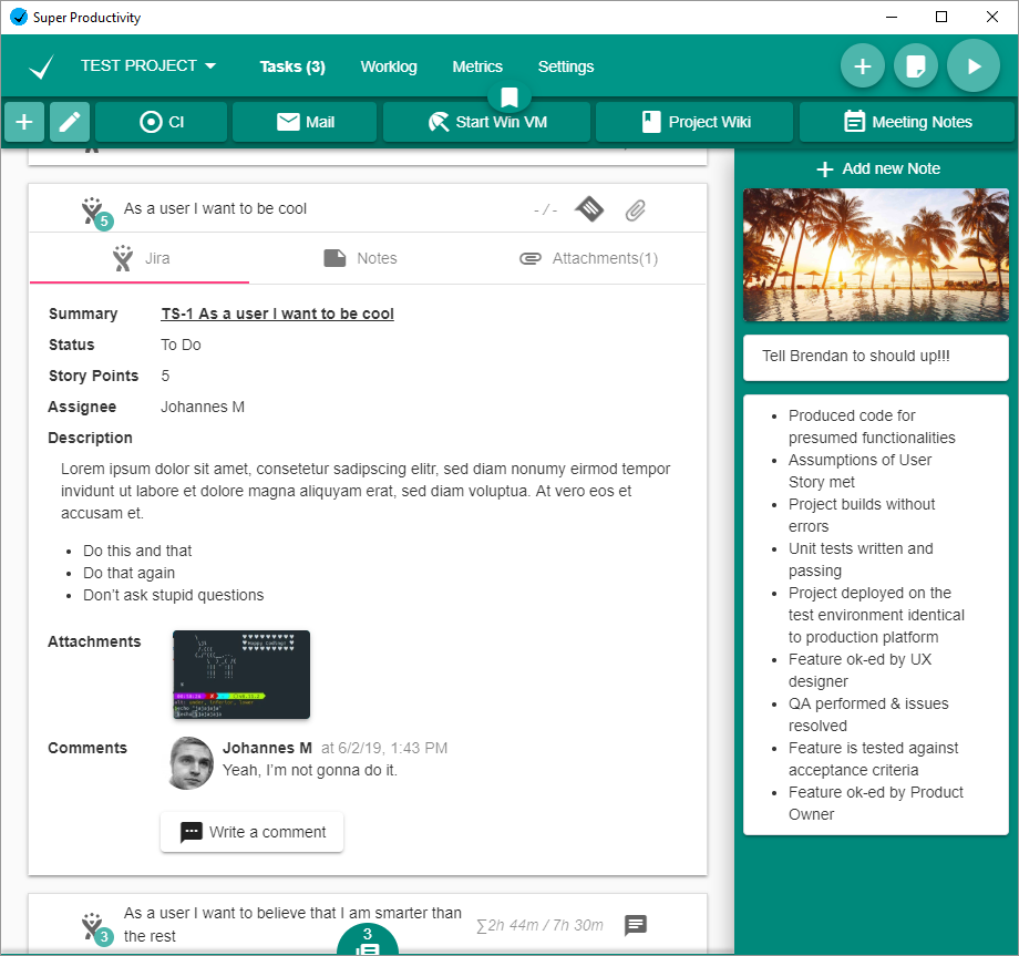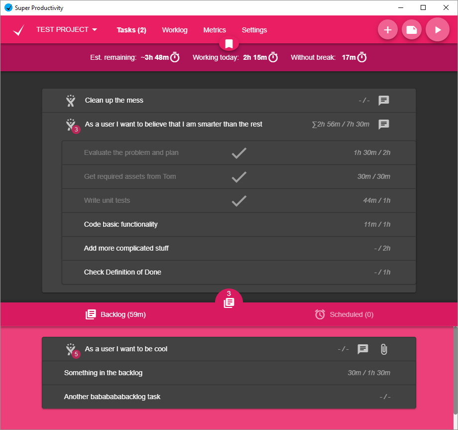 Organize your daily tasks at one place while making time tracking a lot less annoying. Super Productivity is a ToDo List / Time Tracker / Personal Jira Task Manager for Linux, MacOS and Windows aimed at reducing the time you spend with repetitive tasks and to provide you with a place to collect all the information you need to do your job.