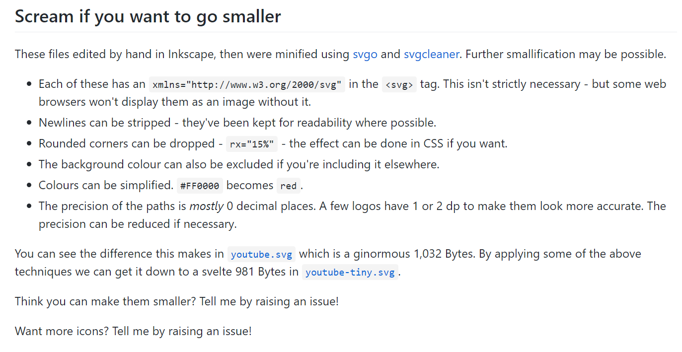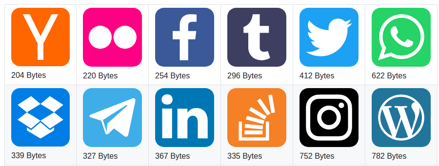 Under 1KB each! Super Tiny Social Icons are minuscule SVG versions of your favourite logos. The average size is 600 bytes! The logos are 400x400 & have a 512x512 viewbox. They will scale up and down to suit your needs.