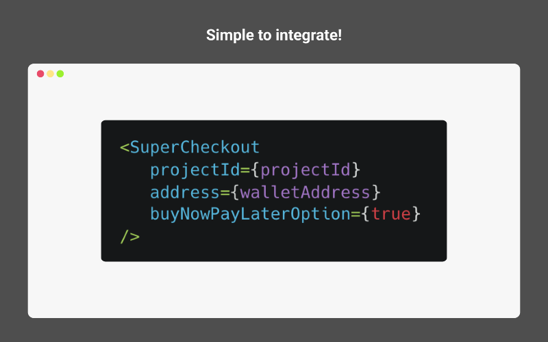 SuperCheckout is the easiest way to allow your community to buy NFTs without crypto or a wallet. Simply pay with your credit card - we handle the details and create a non-custodial wallet for you. It's super easy to integrate into your existing website as well. Just drop our prebuilt react component onto your site. SuperCheckout is completely free for NFT projects. We charge buyers a 4%-6% credit card processing fee. SuperCheckout also has an option to "Buy Now, Pay later". NFTs can be very expensive, resulting in many consumers being priced out of projects. With SuperCheckout Buy Now Pay Later, consumers can pay at their own pace for a small interest fee - again no cost to the project.