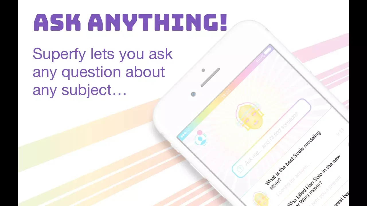 Superfy is the ultimate search disrupter. You want answers, and you want them from someone in the know. Superfy gets you those answers - quickly, meaningfully - and cuts out the fuss of doing so. Superfy makes the magic happen, connecting helpful strangers to one another, via our super-awesome proprietary AI engine. Everyone is an asker and a replier; what makes us super-different is that our algorithm really gets to know all about a user, and the things they know about - from insider info on travel destinations, to personal musical tastes. We make sure your questions go to someone who actually knows what they’re talking about - and helps you establish a connection and then get chatting. We’re changing search and chat as you know it - no more trawling for answers: get your answers in one place, quickly and from someone in the know.