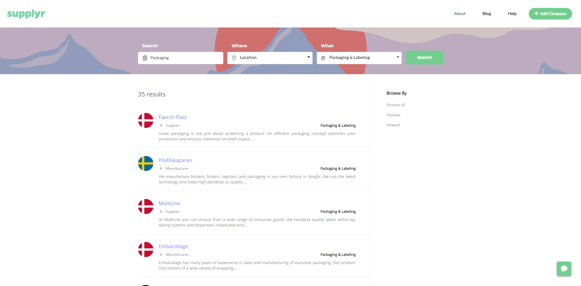 Supplyr is a European b2b search engine, that is beneficial to both entrepreneurs and ordinary people on one hand, and suppliers of all kinds on the other, who wish to increase the number of customers and/or traffic. Our infrastructure is built on the core idea, that trade, business and communication should be easy for everyone. The concept is simple: Anyone can source suppliers via the platform, and any approved supplier can market themselves effectively.