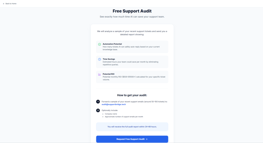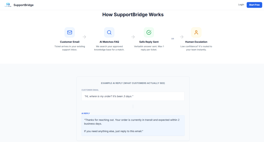 SupportBridge is the only AI support tool that prioritizes your brand’s reputation over reckless automation. AI drafts replies strictly from your approved FAQs, sends at most one response per ticket, and instantly escalates sensitive or complex issues (refunds, passwords) to your team. Setup takes just 5 minutes — simply forward your support email. Get a free audit of your last 100 tickets to see exact time saved and ROI before starting. 14-day free pilot. No credit card. Manual invoicing only when you’re ready. Built for small SaaS & e-commerce teams who want 24/7 support without brand risk.