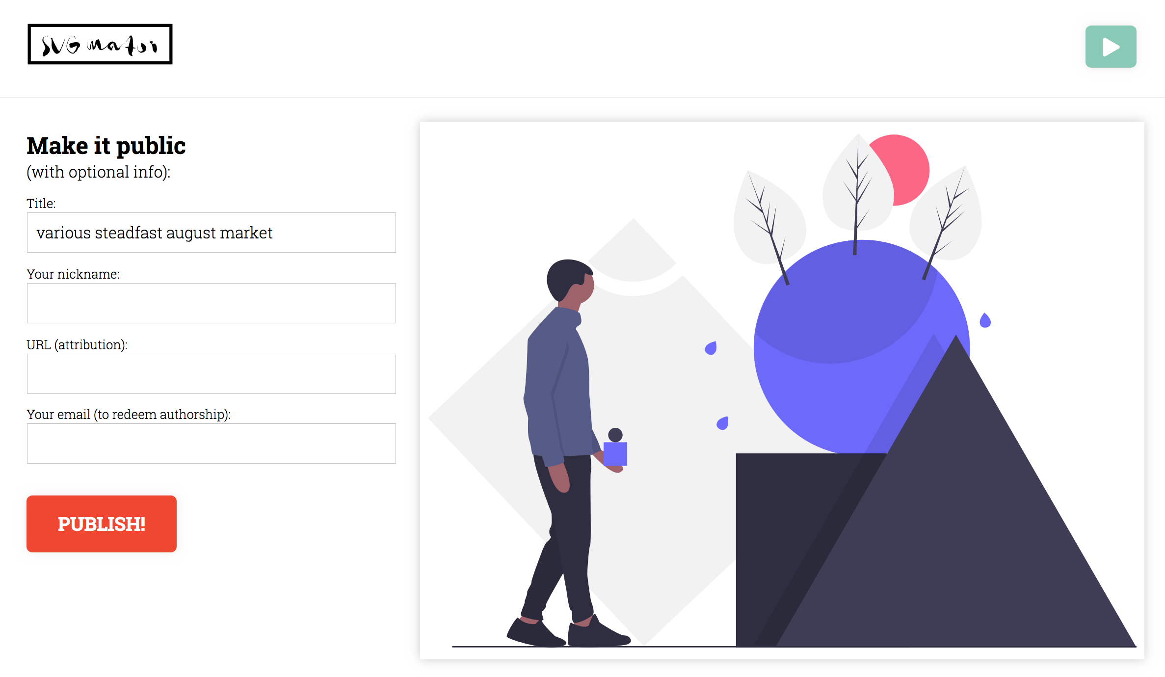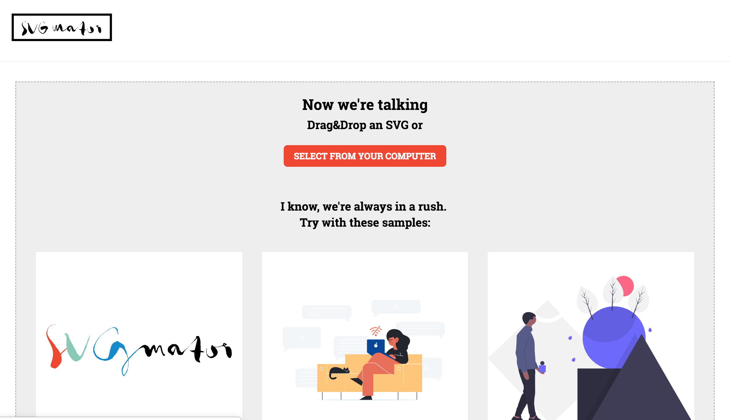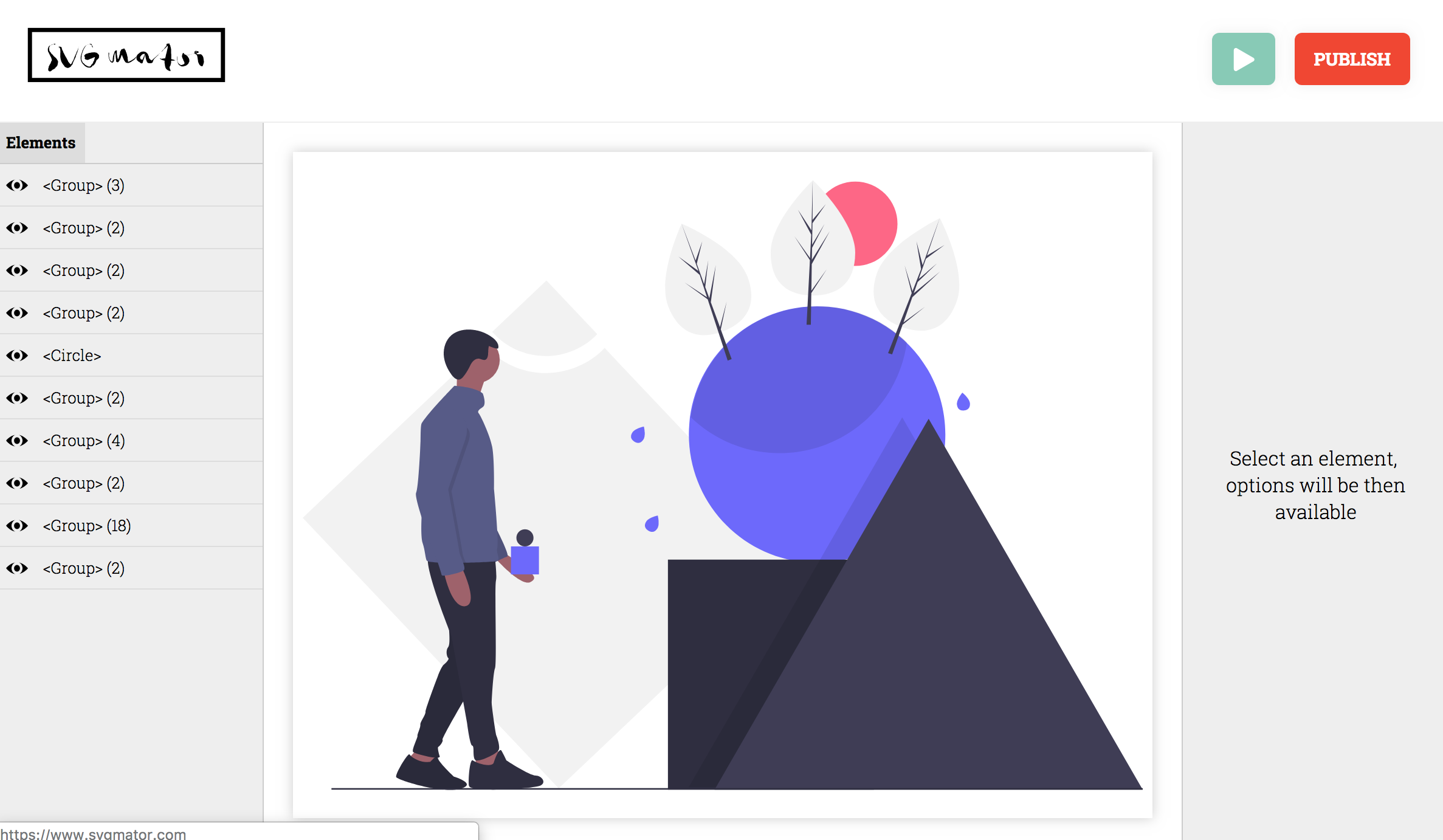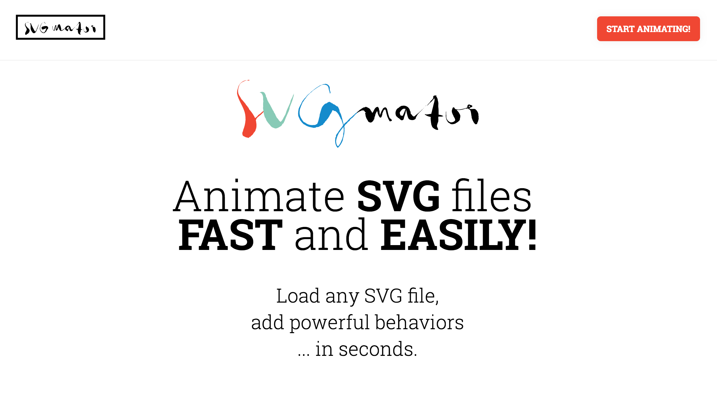 SVGmator! gives you the power to animate vector artworks in a playful way and fast. Simply add behaviors to SVG elements to bring to life static compositions. It's easy, fast and totally free! No registration, no sign-up, just play! You can also publish and share your animation with one click.