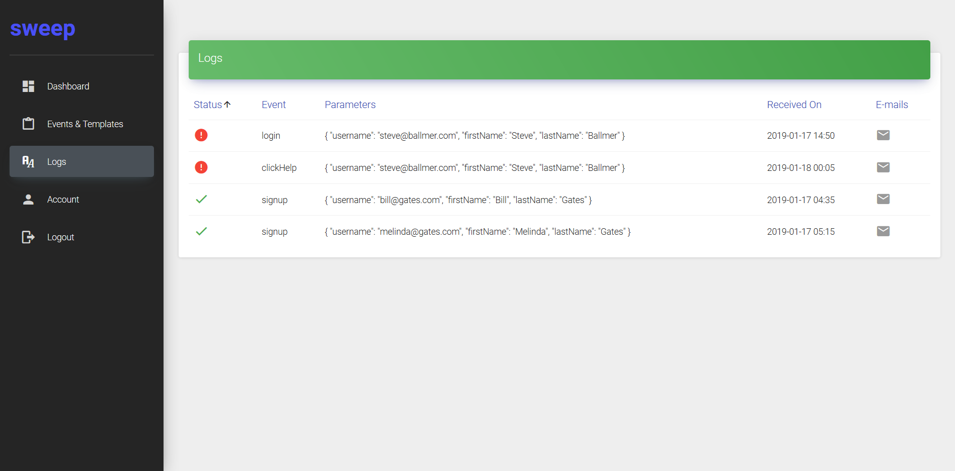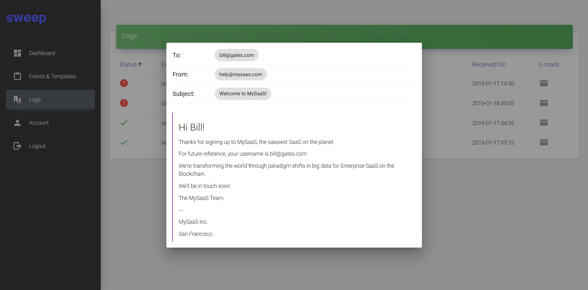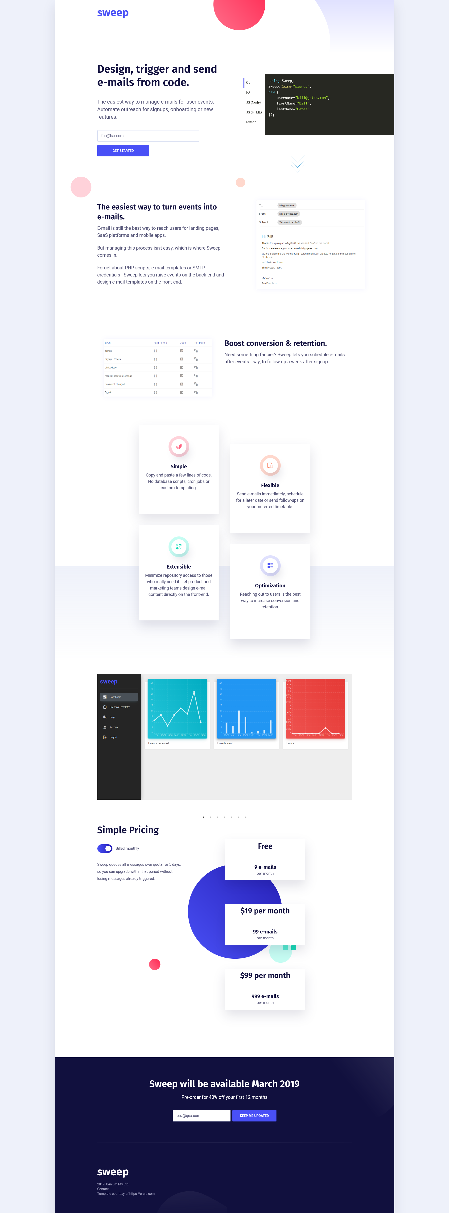 Sweep lets you manage the e-mails sent to users during signup, onboarding, or any other stage of your landing page, SaaS or mobile app. Raise events on the back-end, design and link with an e-mail template on the front-end. Avoid the hassle of PHP scripts, SMTP credentials and custom code to send e-mails. Sweep also lets you schedule follow-up e-mails after events are triggered, automating user outreach to deliver better conversion and retention rates.