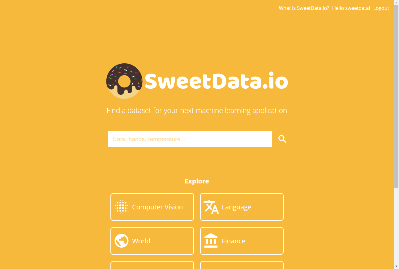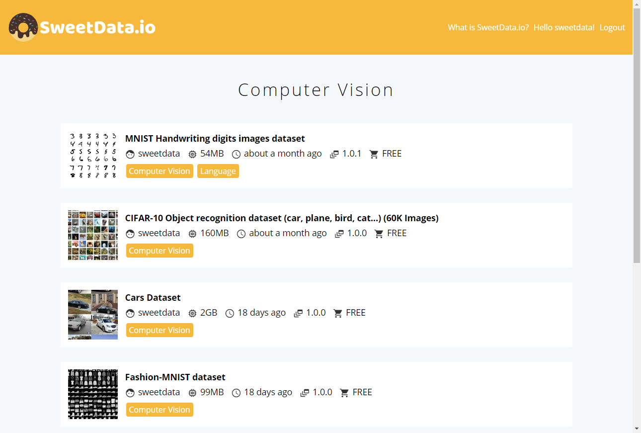SweetData.io is a data marketplace allowing to search, buy, sell and download datasets aimed for machine learning and big data purposes. Data is the new oil, but we need pipelines. SweetData.io provides a way to connect people that have data with developers and industries that need the data to build their AI applications. Developing machine learning applications requires large amounts of high-quality data. Whether it is for developing a new computer vision system or predicting the weather, building these systems involves collecting large amounts of data which is often difficult. By providing a way to quickly find and buy already compiled data, developers can save a lot of time and money through SweetData.io rather than doing the same work someone has already done before.