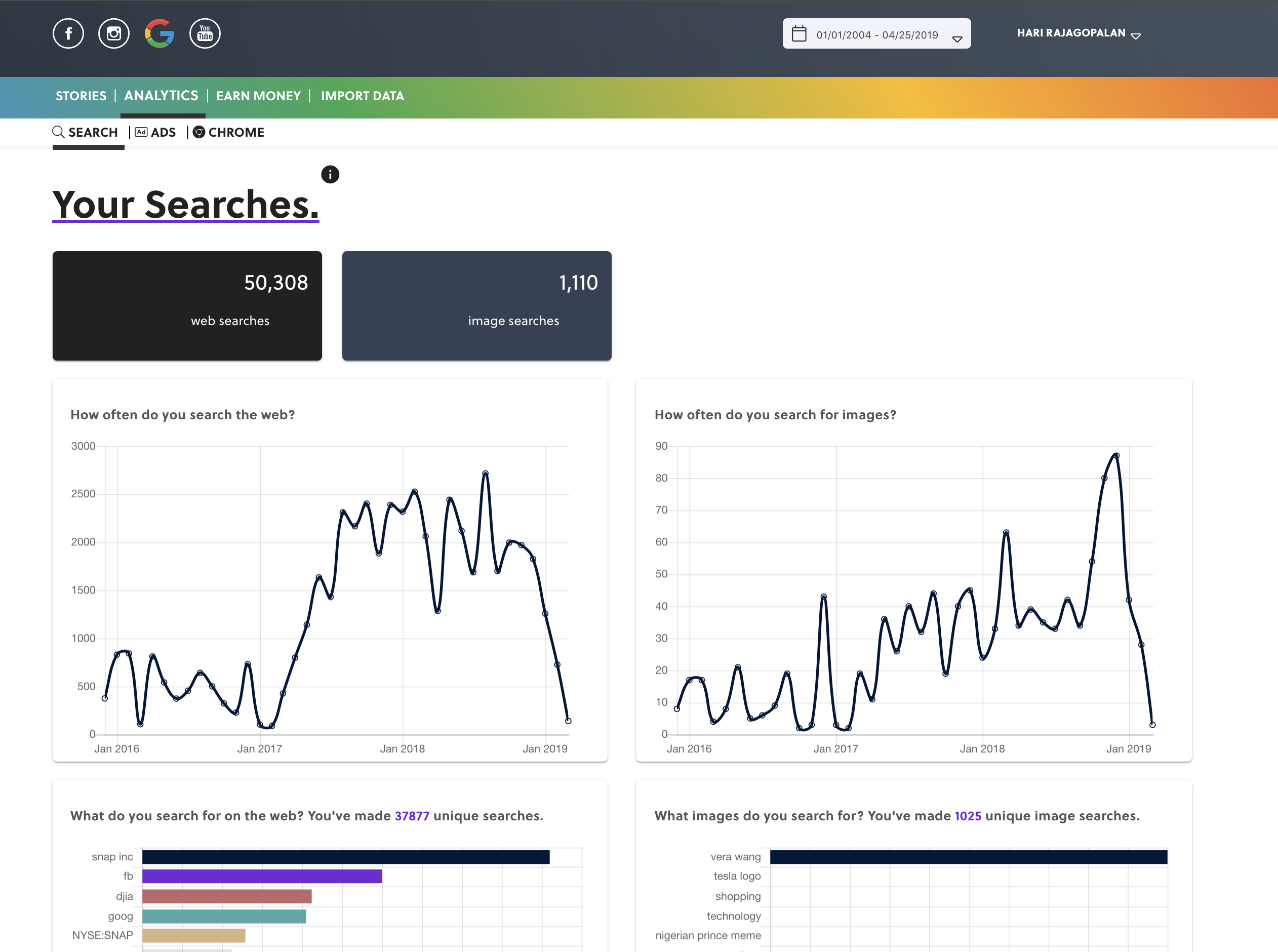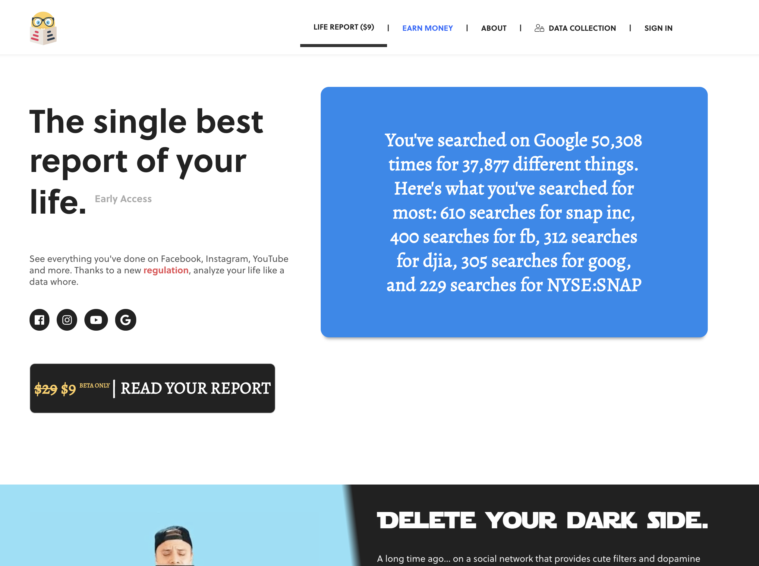 Built by ex-Googlers who previously worked on analytics, we're helping people analyze and sell their own data. Analyze yourself like never before with the world's best report on yourself. Sell your data directly to companies. Who said you wasted all that time on social media?