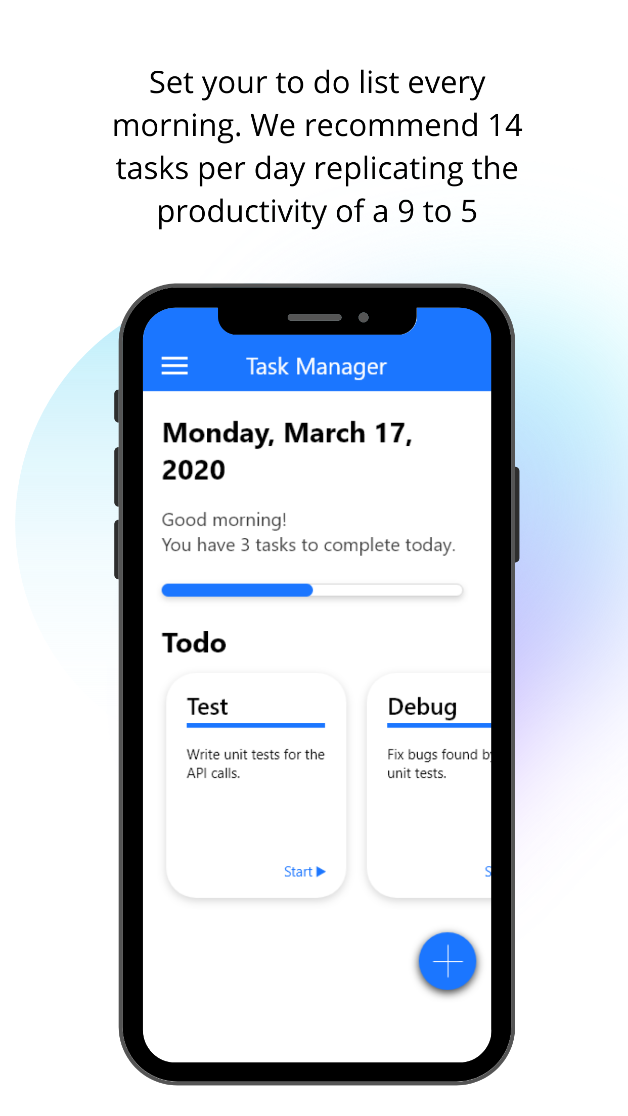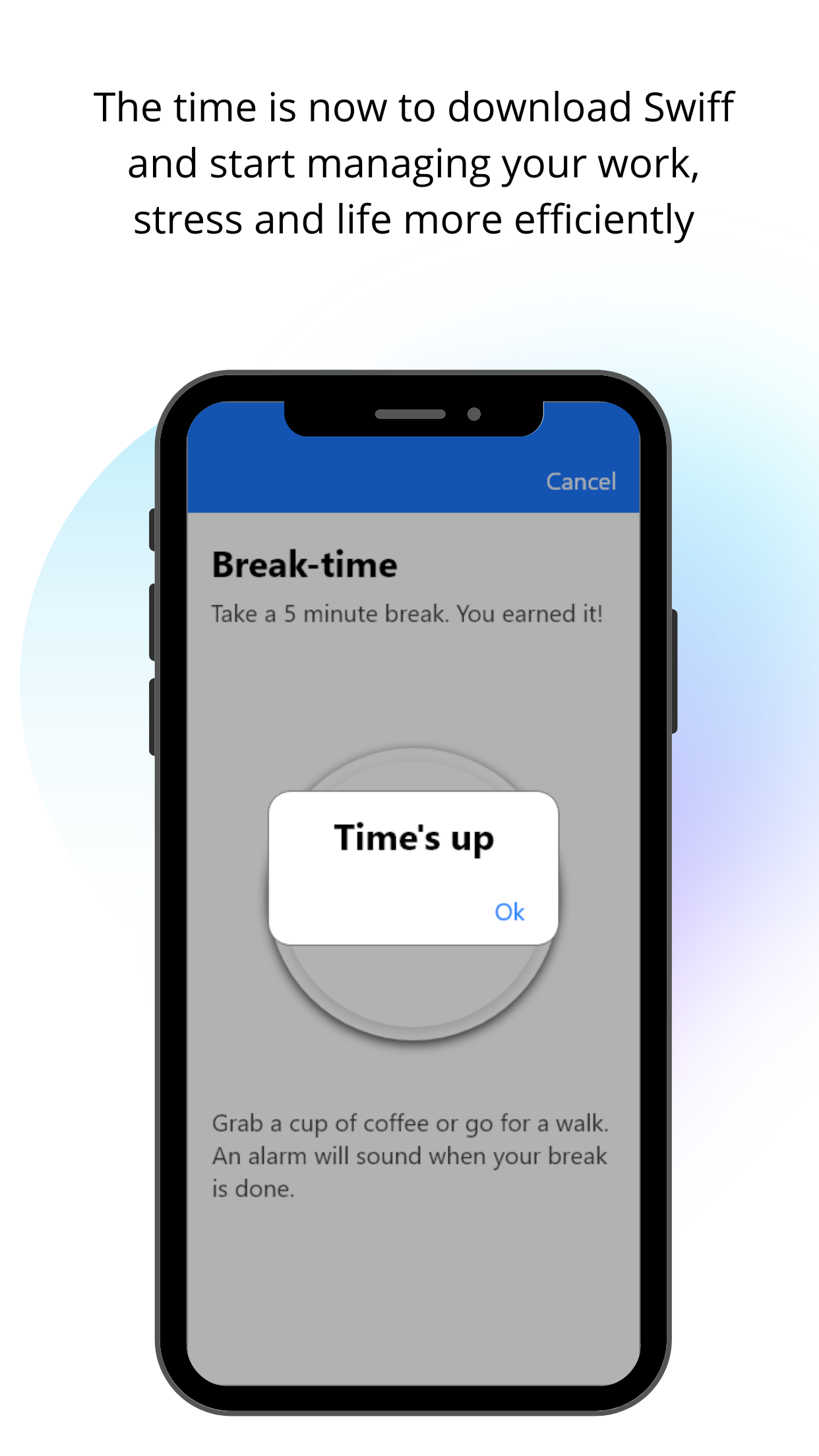 A UN survey found that 41% of remote workers suffered from depression and these stats don't account for the economic downturn, global heath pandemic and social isolation those today are experiencing. Swiff uses scientifically proven methods to reduce stress. Looking to help mitigate the potentially disasterous mental health effects of having a mass amount of people isolated, working from home, fearing for their jobs and health. A small step to help regulate their work days with a view to adding more features focused on mental health in the coming days. Swiff is a simple application that will help you manage when working from home. Once you download the application, every morning you write down your list of tasks to do. This list should have 14 tasks that can be completed in 25 minutes. When you start a task click 'start' in the application, a work timer will appear to countdown your working times. Once it expires a 5-minute break clock automatically starts. This is a scientifically proven method of work that will increase productivity while decreasing stress.