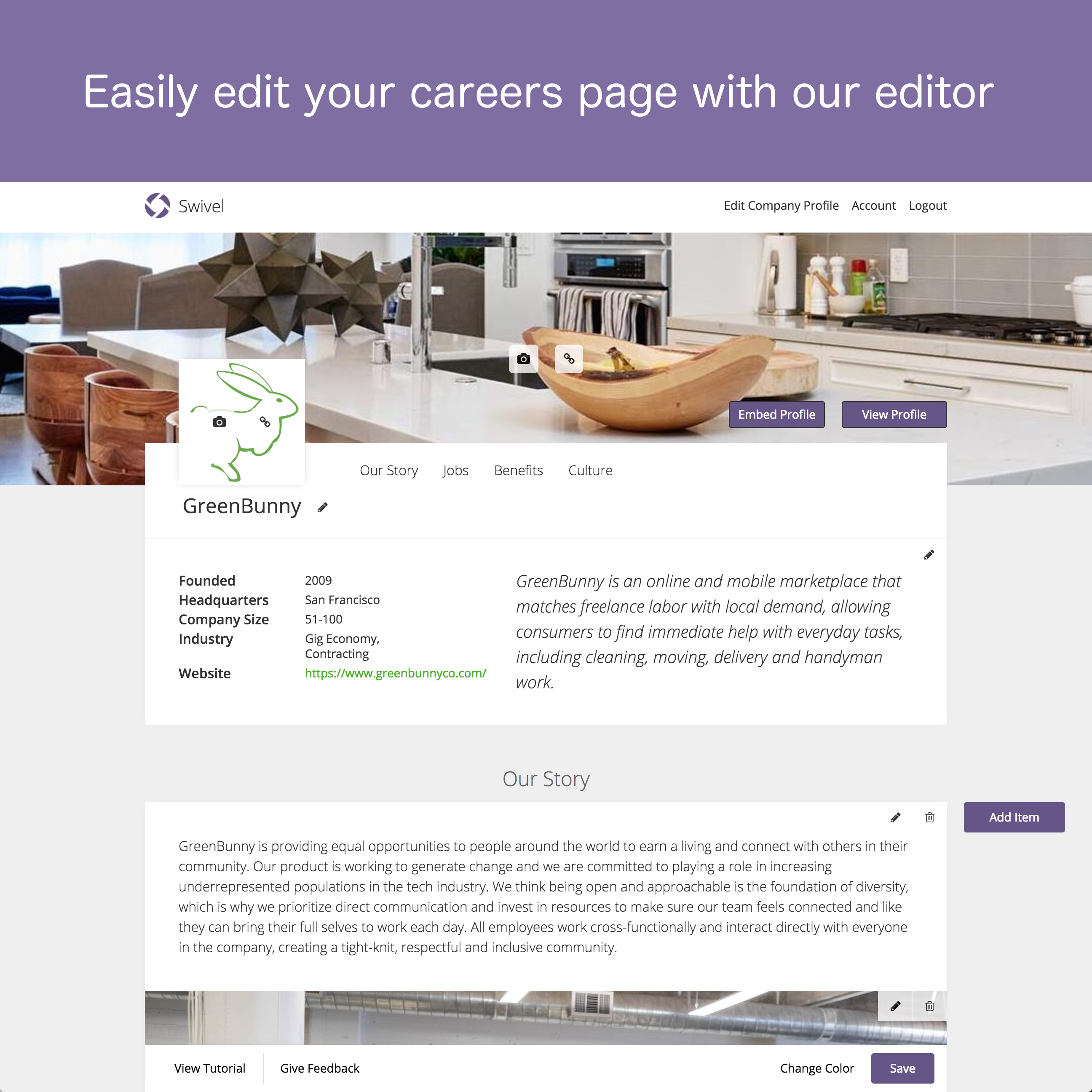 Some companies don’t have the time or resources to create an appealing careers page, but it’s the first point of contact for most job seekers. We made Swivel so companies can quickly create and embed a careers page right into their website and provide an appealing brand to prospective employees. Say hi at [email protected]. We would love to hear your feedback!