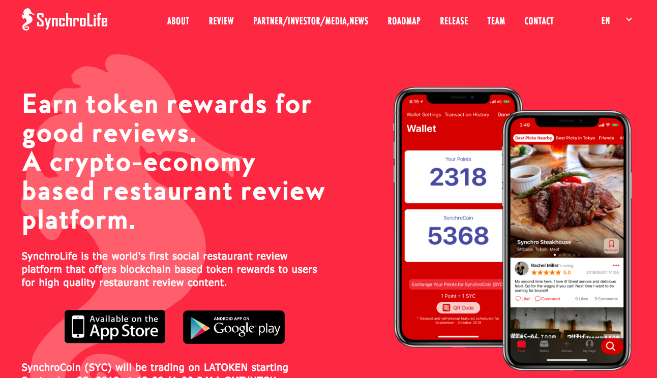 SynchroLife is the world's first social restaurant review platform that offers blockchain based cryptocurrency token rewards to users for high-quality restaurant review content and for dining at participating restaurants. SynchroLife aims to build a worldwide restaurant review platform that solves the problems of restaurant discovery with a token economy and AI. The SynchroCoin (SYC) token is used in SynchroLife as a reward for posting restaurant reviews and as cashback rewards for dining at participating restaurants. In the future, the SynchroCoin will also be usable for payment at restaurants. AI is used in the app to learn user restaurant preferences and compare each user to each other in order to give personalized restaurant recommendations and search results-- making restaurant search and discovery easier than ever. Although SynchroLife was originally launched in Japan, it is now available for use in over 155 countries and in four languages (English, Japanese, Korean, Chinese).
