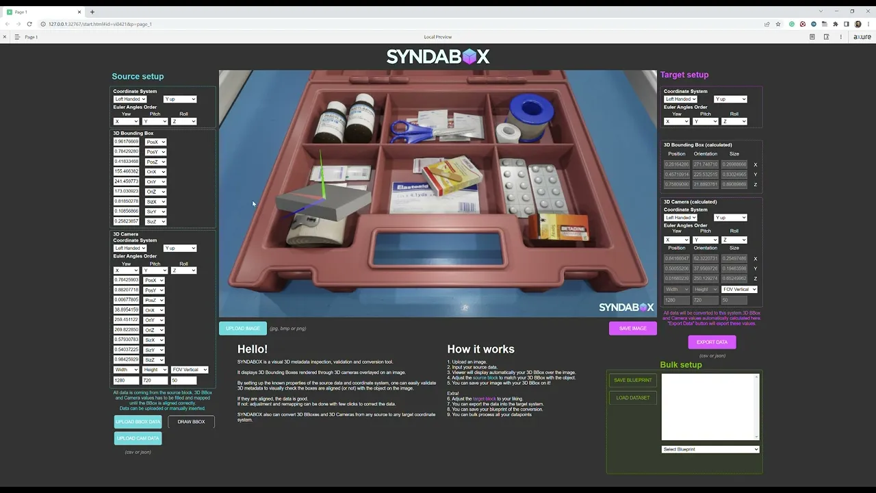 SYNDABOX is a visual 3D metadata inspection, validation, and conversion tool. It displays 3D Bounding Boxes rendered through 3D cameras overlayed on an image. By setting up the known properties of the source data and coordinate system, one can easily validate 3D metadata to visually check the boxes are aligned (or not) with the object on the image. If they are aligned, the data is good. If not: adjustment and remapping can be made with a few clicks to correct the data. SYNDABOX also converts 3D BBoxes and 3D Cameras from any source to any target coordinate system.
