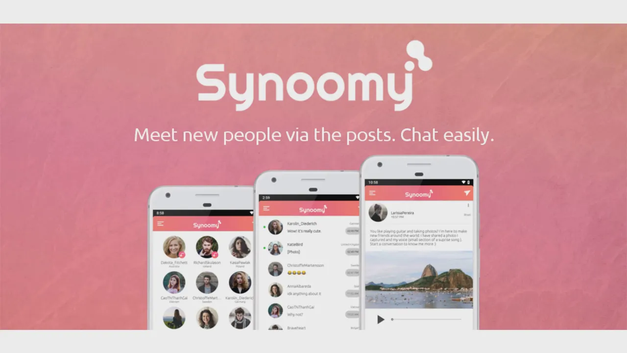 Let your post roam all over the world. Meet with new people, make new friends. Chat easily. Discover new cultures. Improve your language skills. Synoomy provides you to able to send and receive random posts and chat with people who you met via the posts. Things you wanna write, your memories you wanna share, your dreams, a creative idea, photos you captured, voice messages, everything you wanna share. Share valuable and precious posts for leading to deeper conversations and quality friendships. How it works? Posts that can contain text, picture or voice are sent to randomly selected users who can speak language you selected. You can also use different filters like gender, age range or country. Users who received your posts can start a conversation with you or skip the post. Similarly, you receive posts and you can start conversations. Posts take you to new people all over the world. Download now and start to discover Synoomy.