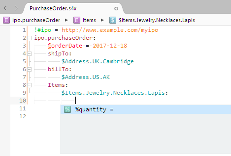 Syntactik language represents XML and JSON documents in a different form using people-friendly syntax. The new representation improves the productivity of people who create, edit or analyze XML and JSON. Code reuse features of Syntactik language brings editing effectiveness and readability to the next level. Syntactik Editor is a multiplatform editor for the new language. The editor increases productivity even more by organizing Syntactik files in projects, highlighting and checking the validity of the code, converting formats, compiling, and providing essential editing features.