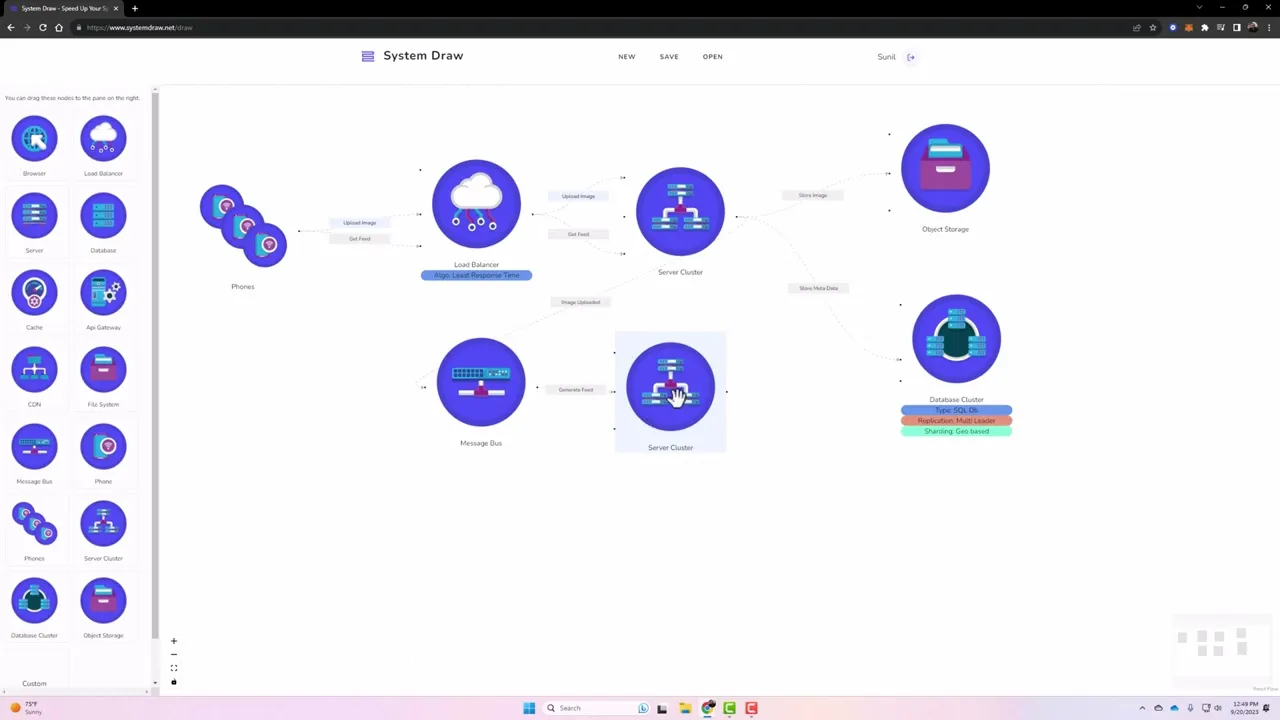 No need to import or search for system nodes like you would in a generic drawing tool. The most common system nodes are readily available. You can configure nodes with attributes that no other site does. For example, you can configure a load balancer with the kind of algorithm it uses: round robin, least connections, etc. You can configure a database with the kind of replication it uses, kind of sharding, etc. This tool also helps students reduce the guesswork in system design and think about all the options available to them. The holistic system design can be depicted in the diagram. This tool helps system architects quickly represent their ideas in a diagram.