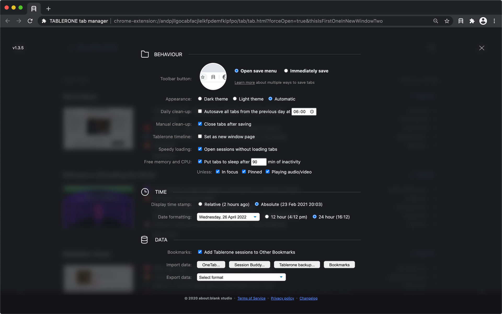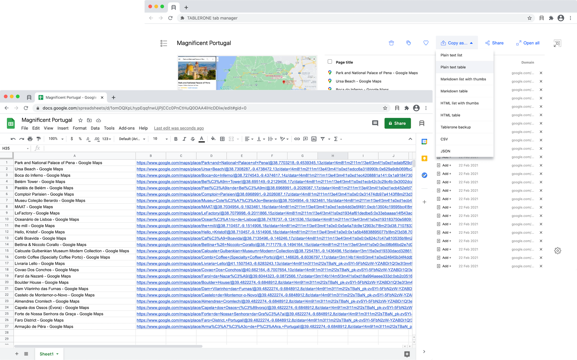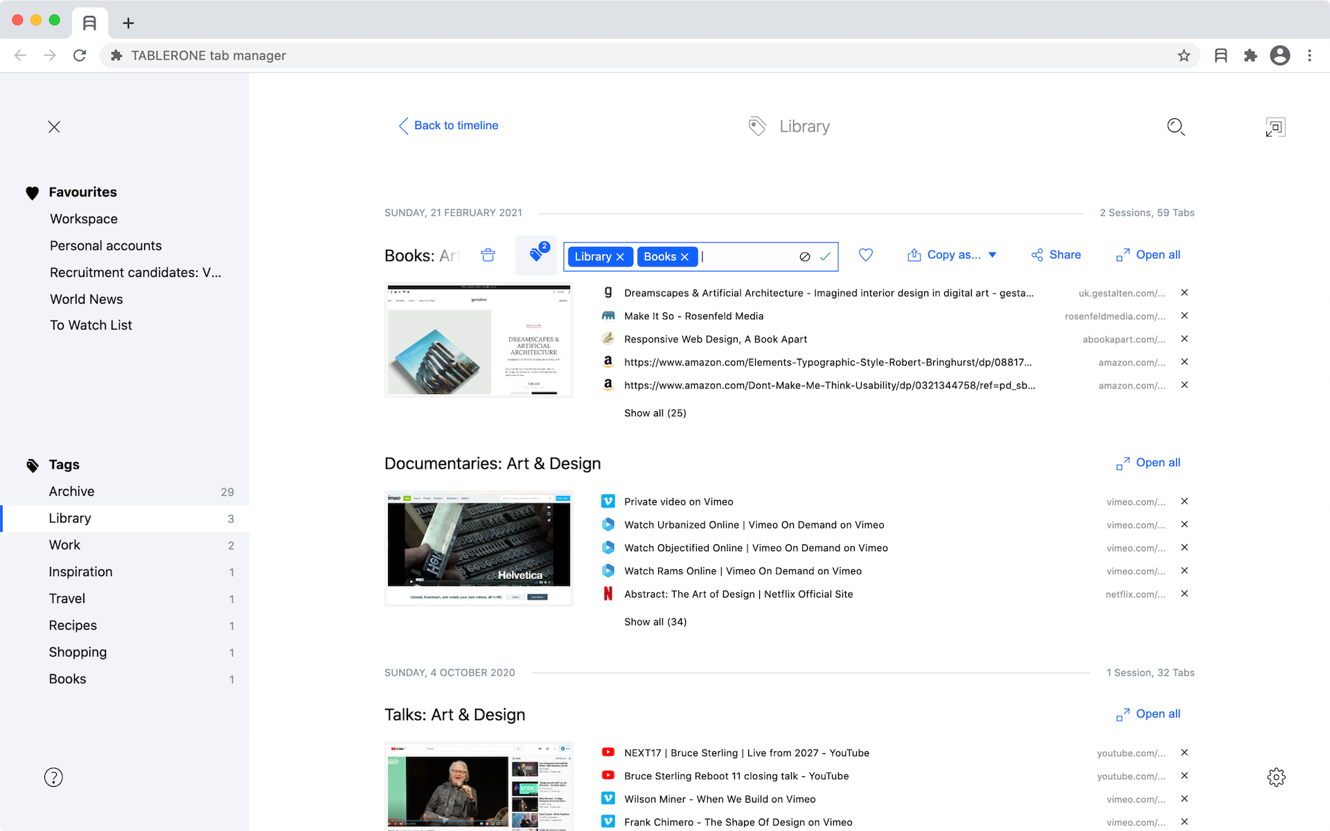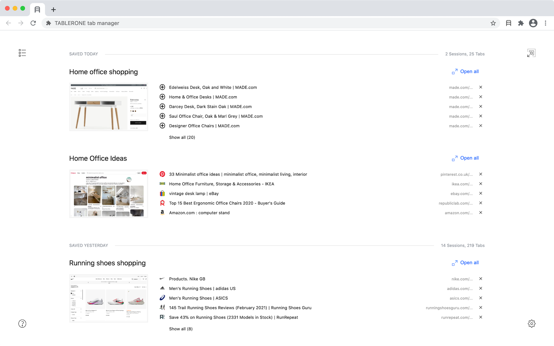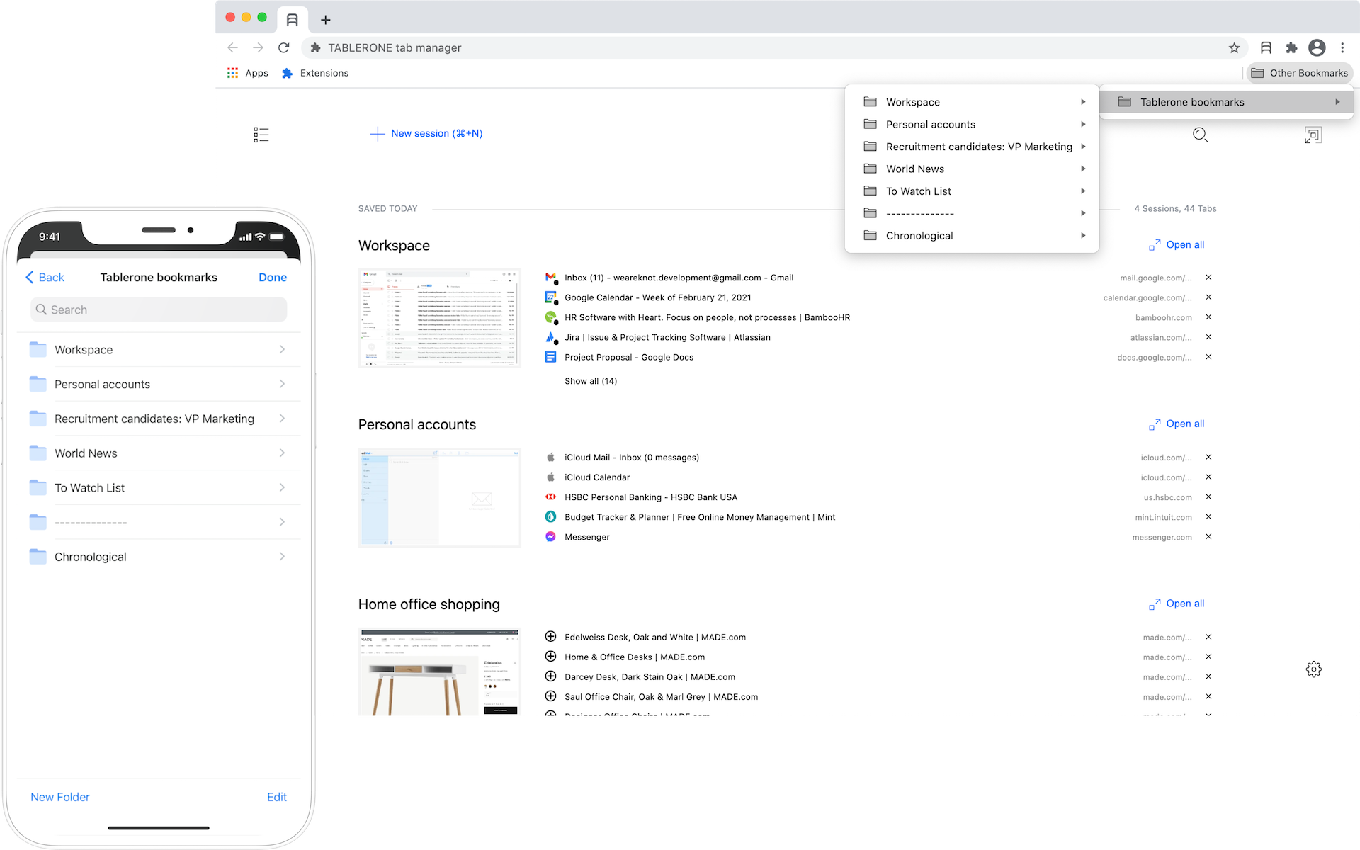 Close tabs without losing them. Get more done with organised workspaces and bookmarks. Tablerone does what your browser should but doesn’t: ? Save tabs in a session with one click ??‍?? Reopen any session where you left off ?? Restore tabs after a browser crash ? Copy multiple URLs ? Share multiple links with one link ? Better history of browsing