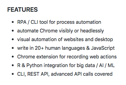 TagUI is an open-source RPA (robotic process automation) software for automating UI interactions. Use cases include process automation, data acquisition and testing of applications. It takes in 21 different human languages' descriptions of UI interactions and translate them into executable code to drive automation of sequences of actions. There are visual recognition / OCR abilities, and Python / R integrations for machine learning capabilities. There is also a Chrome web browser extension for recording automation steps for web applications. No setup is needed, unzip and run on macOS, Linux, Windows. For more info, visit TagUI GitHub page. This is a full-feature and free open-source tool, there's nothing to upgrade to or any paid subscription. To feedback suggestions or bugs, raise an issue at TagUI GitHub page. TagUI is maintained by AI Singapore (aisingapore.org), a government-funded initiative to build local artificial intelligence capabilities.