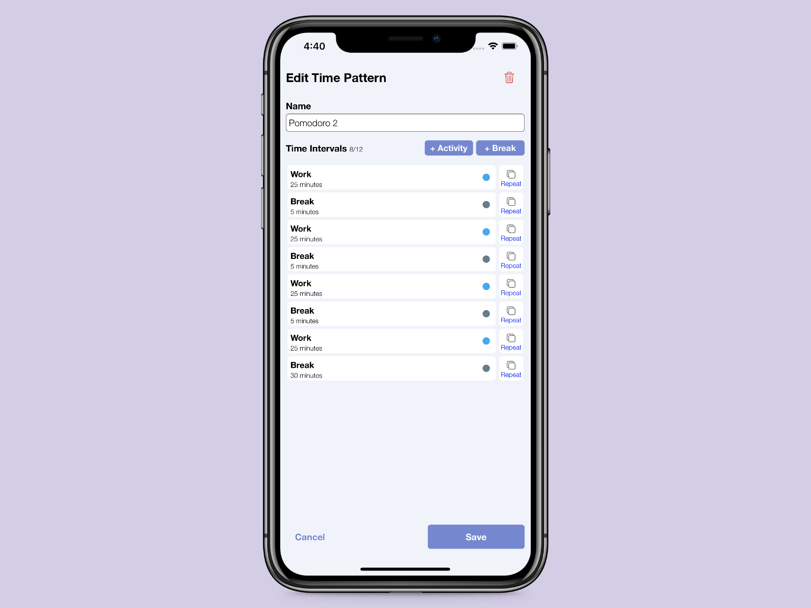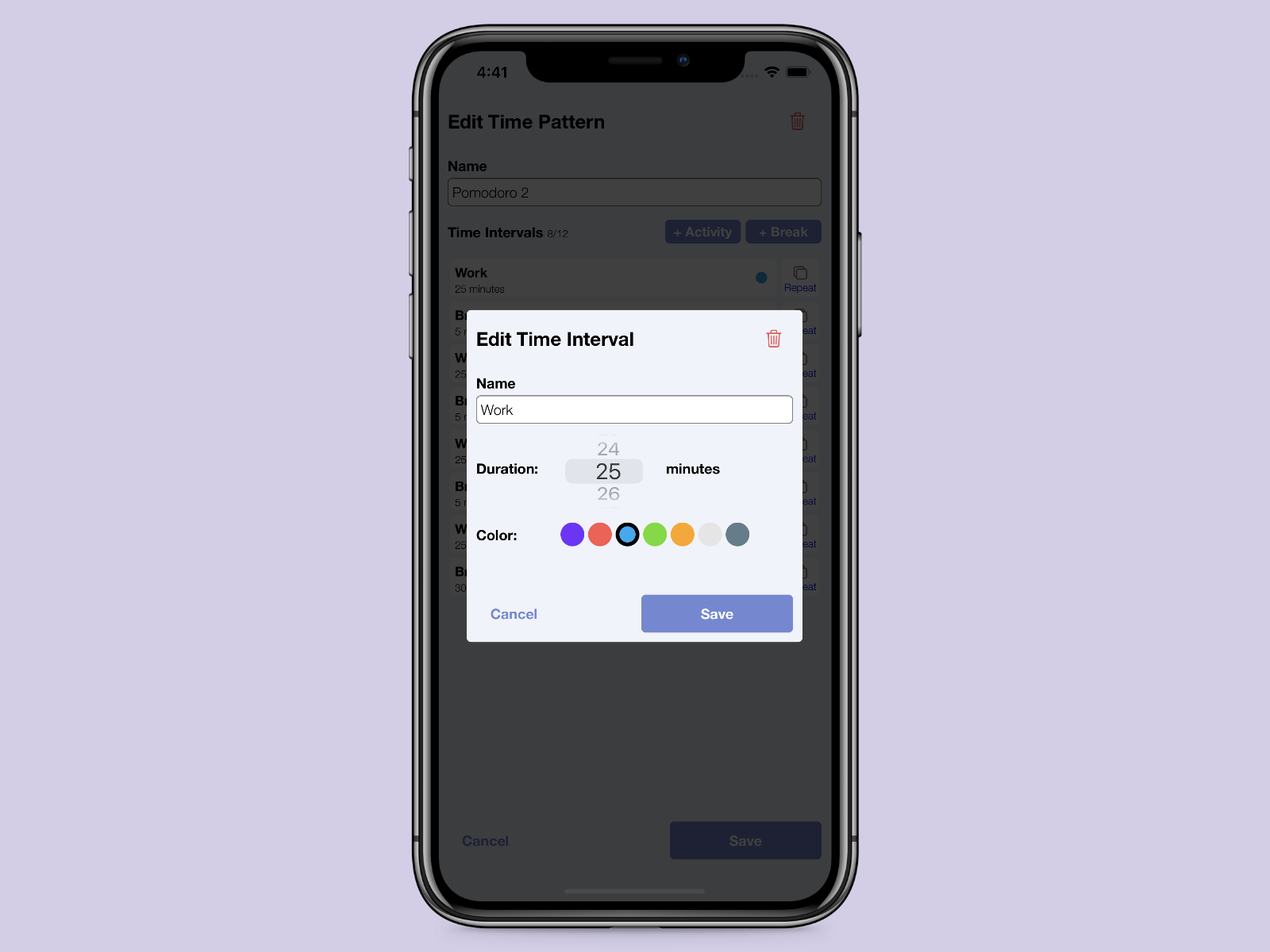 Reminders to take breaks. Sync your schedule with friends or colleagues so you can hang out during your breaks together. With Take a (sync) Break you can create custom work-break time patterns and be notified whenever it's time to take a break or resume work. You can sync a time pattern with others so all of you can take the breaks at the same time. You can also import/export your custom time patterns and share them.